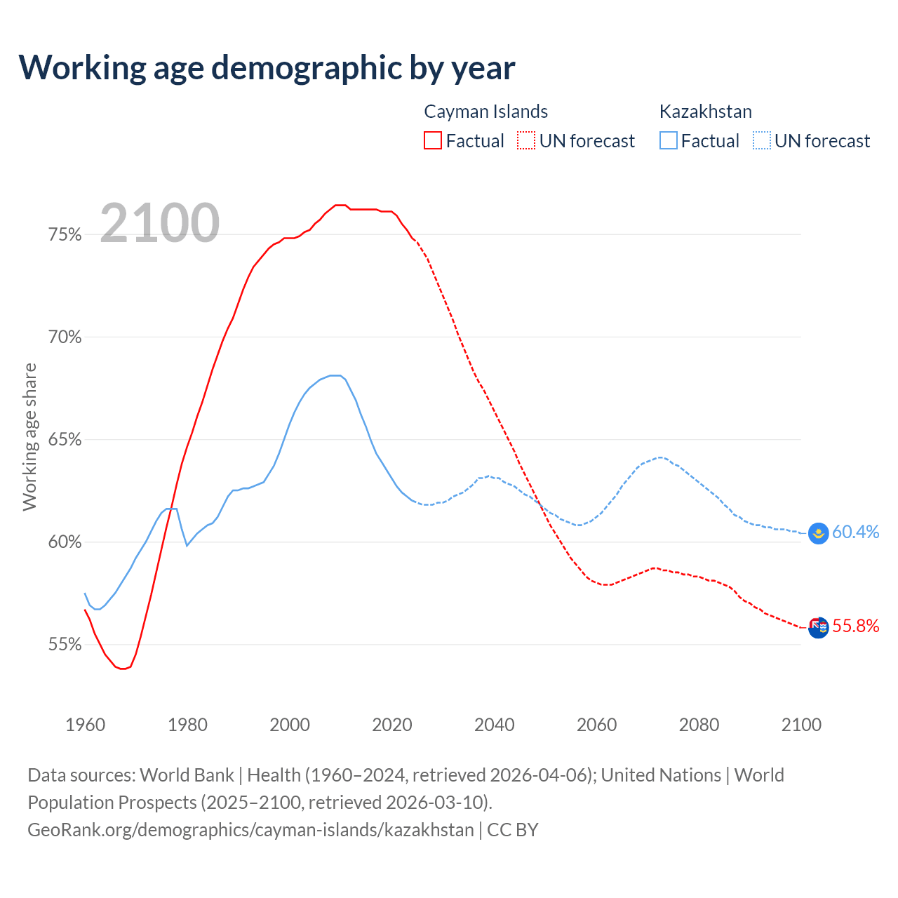 - The Cayman Islands has 58.1K working age adults (aged 15-64) vs 13.1M in Kazakhstan.