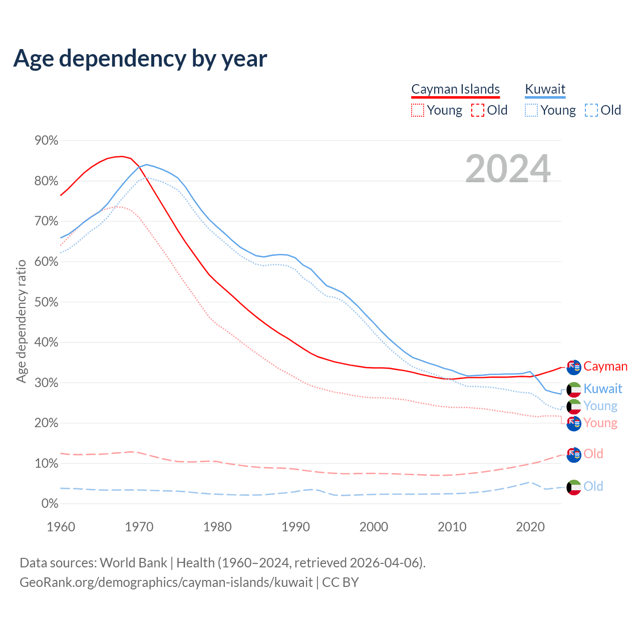 The share of older people aged 65 and over is 9% in the Cayman Islands and 3.1% in Kuwait. Life expectancy in the Cayman Islands compared to Kuwait .