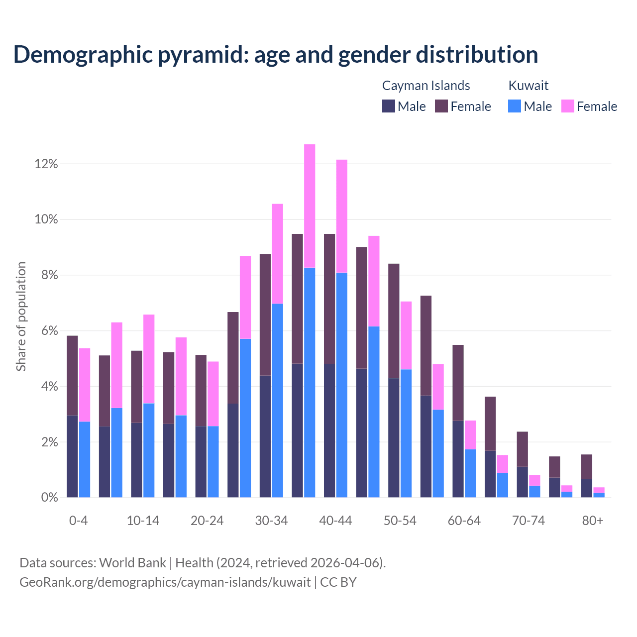 - As of 2026, the population of the Cayman Islands is 77.6K vs 5.1M in Kuwait - 65.7 times difference.