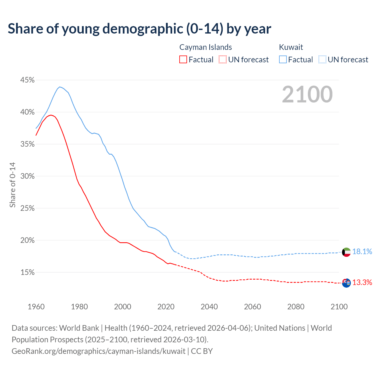 - The share of young demographic (0-15 years old) in the Cayman Islands is 16.2% vs 18.2% in Kuwait.