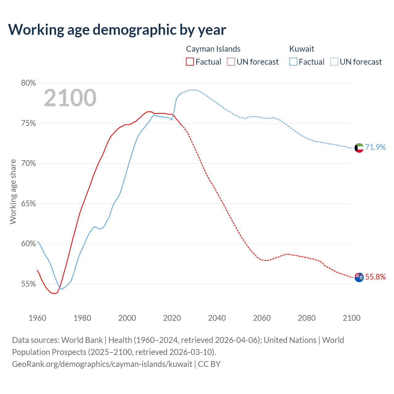 - The Cayman Islands has 58.1K working age adults (aged 15-64) vs 4.01M in Kuwait.