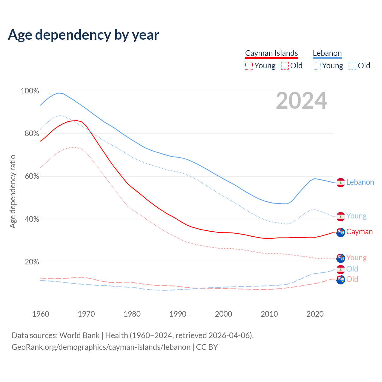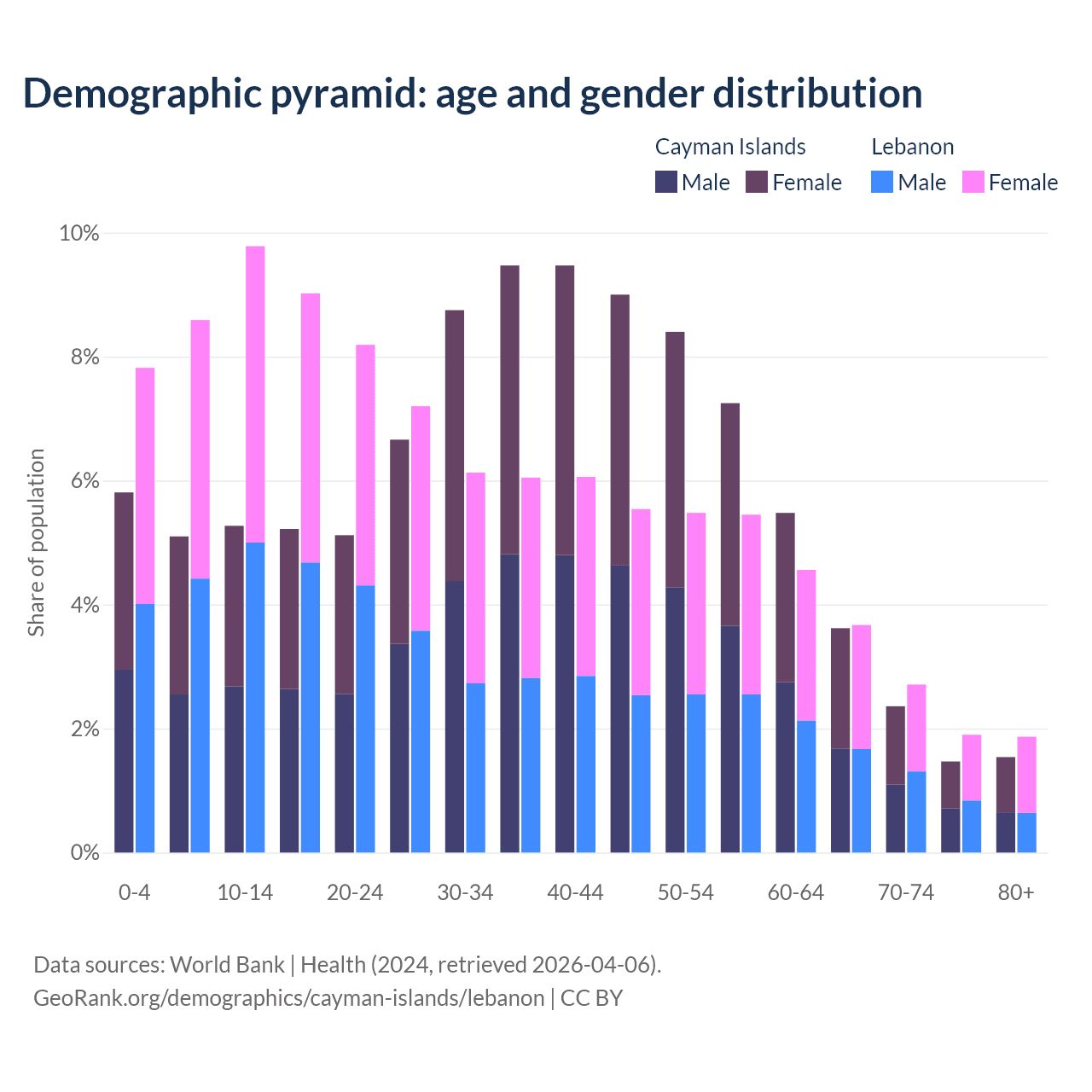 The share of older people aged 65 and over is 9% in the Cayman Islands and 10.1% in Lebanon. Life expectancy in the Cayman Islands compared to Lebanon .