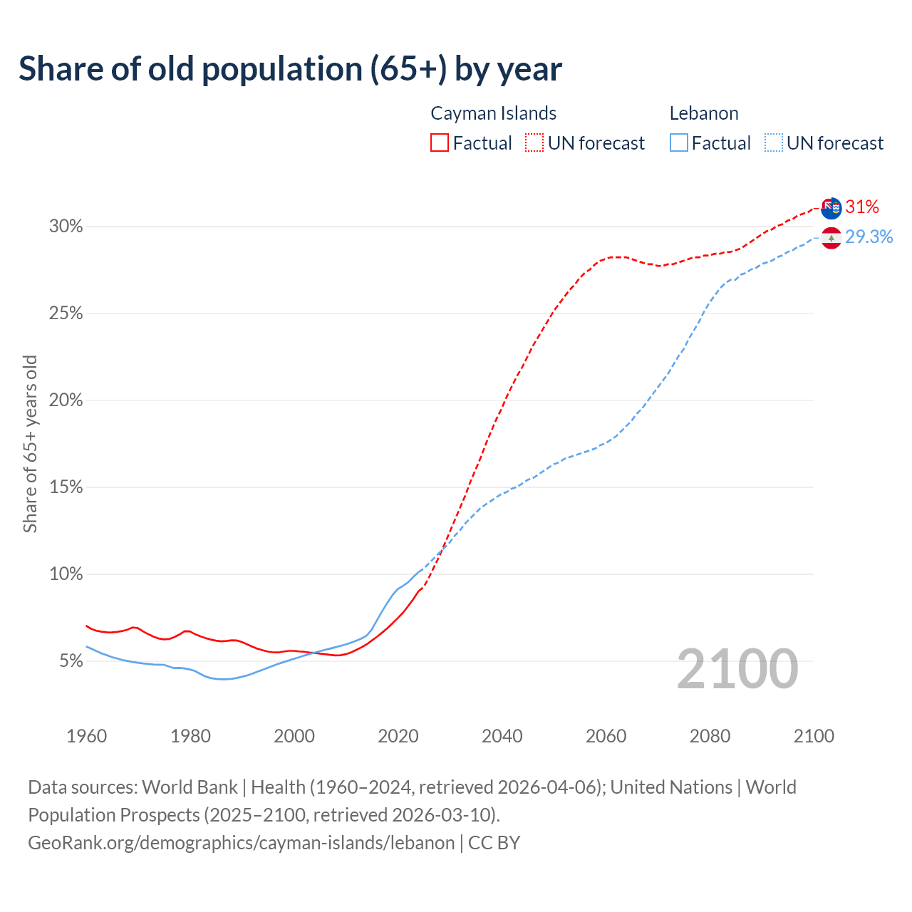 - The share of old-age demographic (65+) in the Cayman Islands is 9% vs 10.1% in Lebanon.