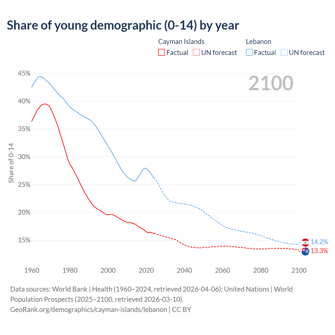- The share of young demographic (0-15 years old) in the Cayman Islands is 16.2% vs 26.2% in Lebanon.