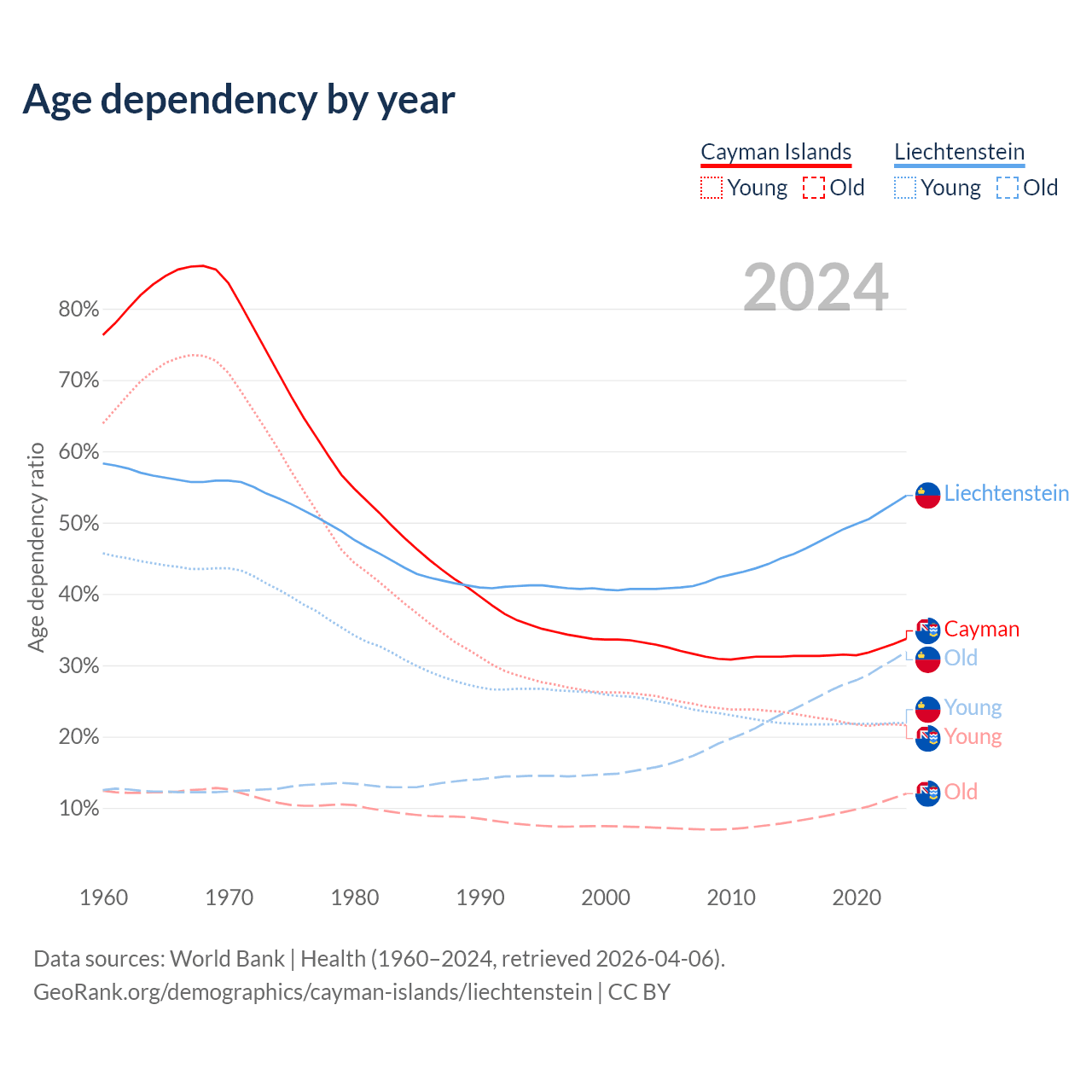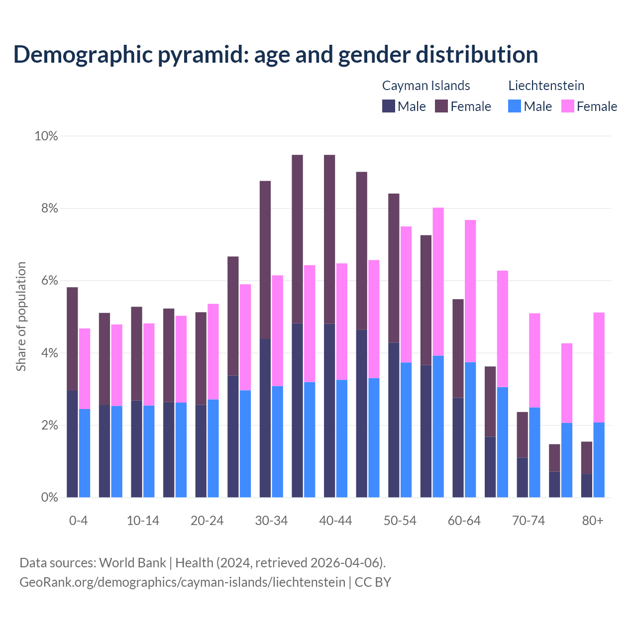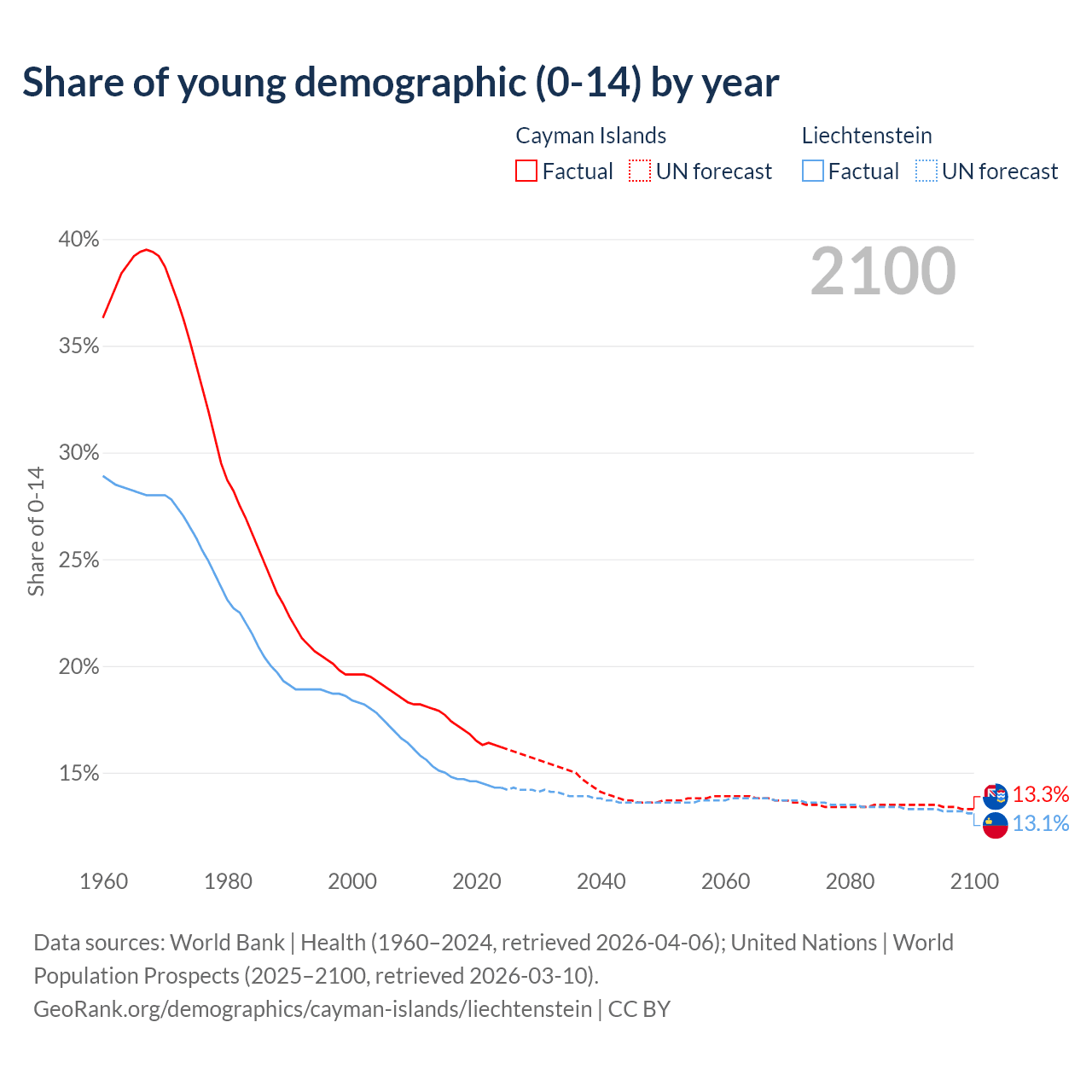 - The share of young demographic (0-15 years old) in the Cayman Islands is 16.2% vs 14.3% in Liechtenstein.