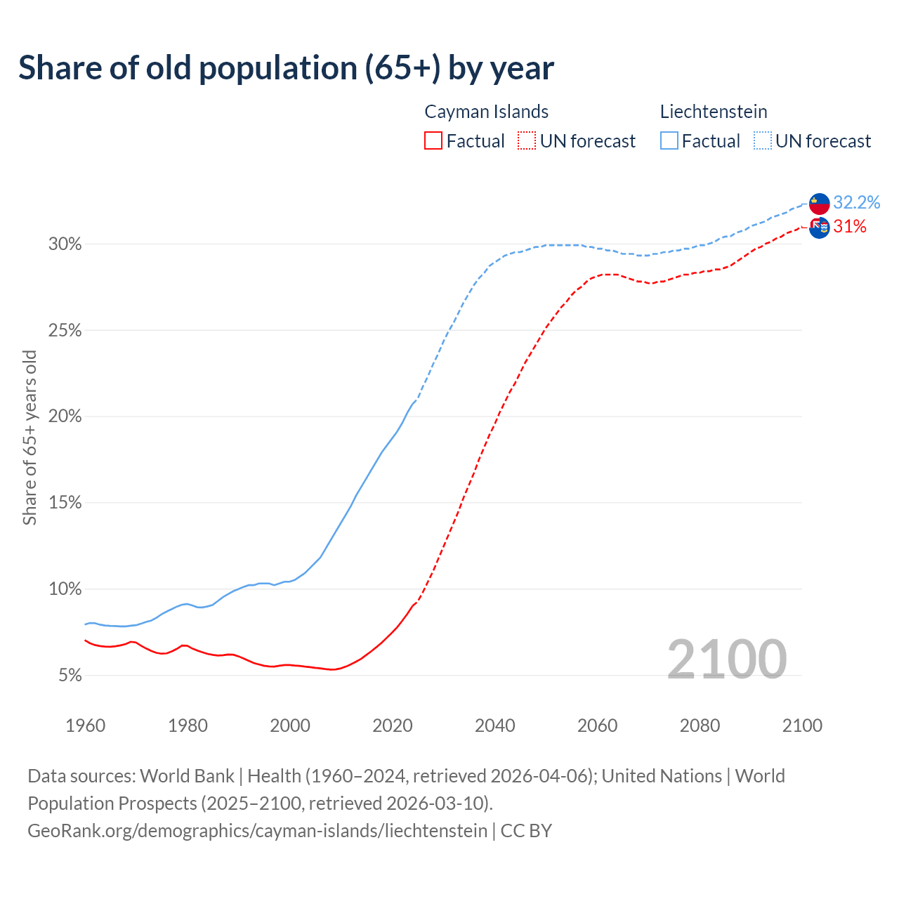 The share of older people aged 65 and over is 9% in the Cayman Islands and 20.7% in Liechtenstein. Life expectancy in the Cayman Islands compared to Liechtenstein .