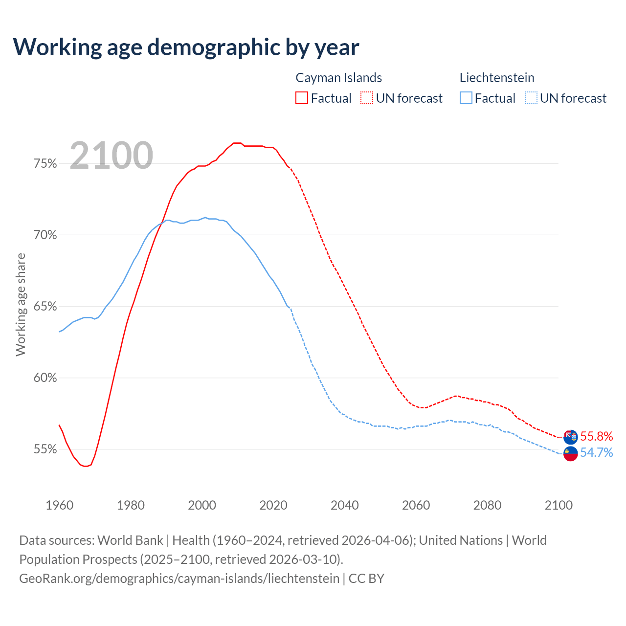 - The Cayman Islands has 58.1K working age adults (aged 15-64) vs 26.7K in Liechtenstein.