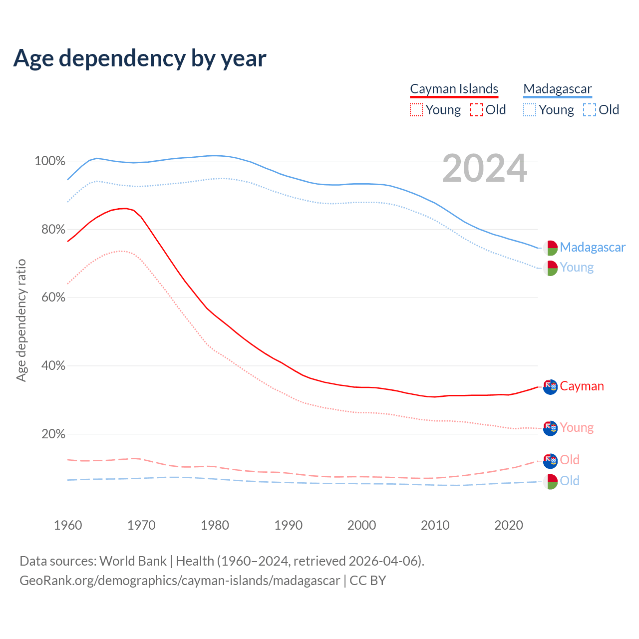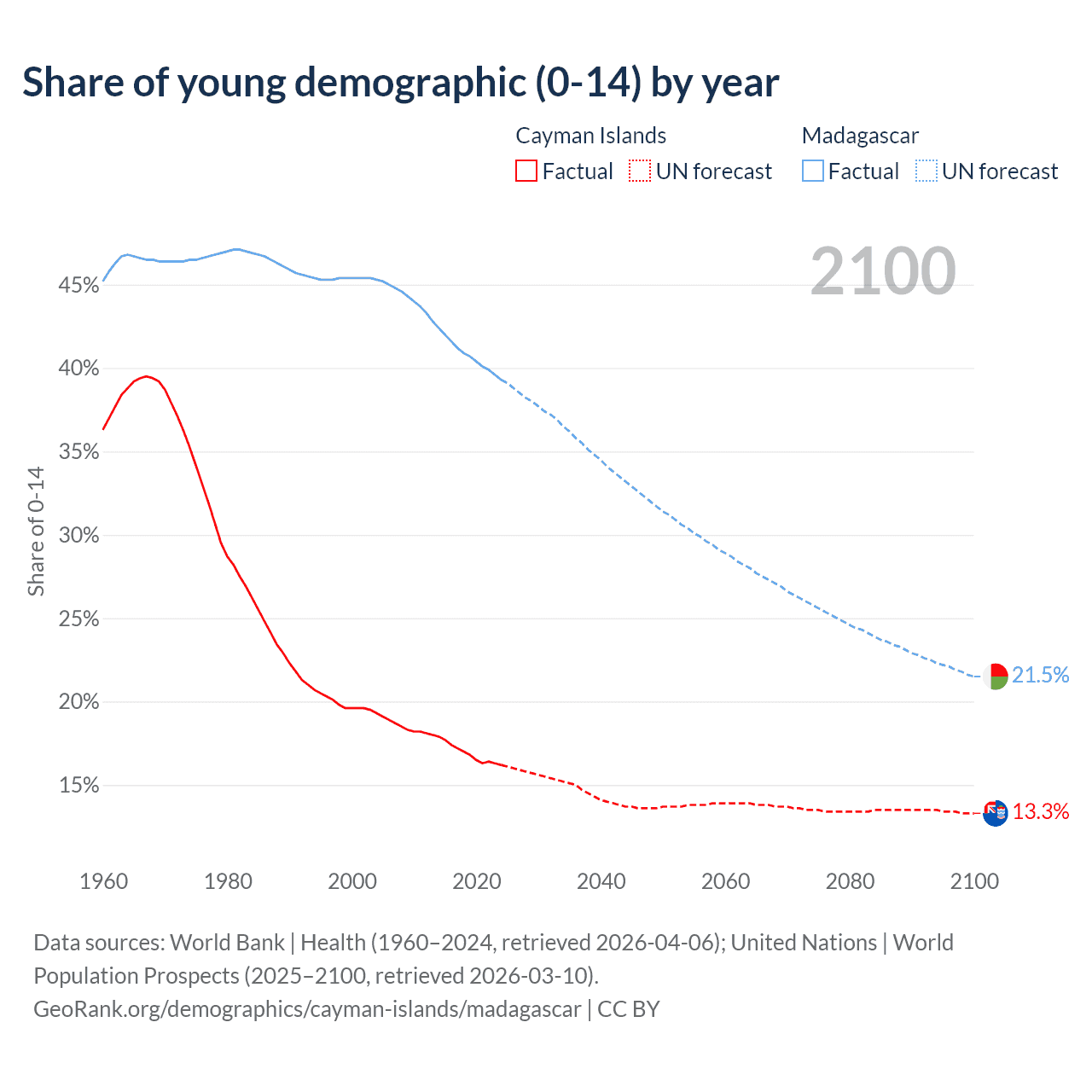 - The share of young demographic (0-15 years old) in the Cayman Islands is 16.2% vs 39.3% in Madagascar.