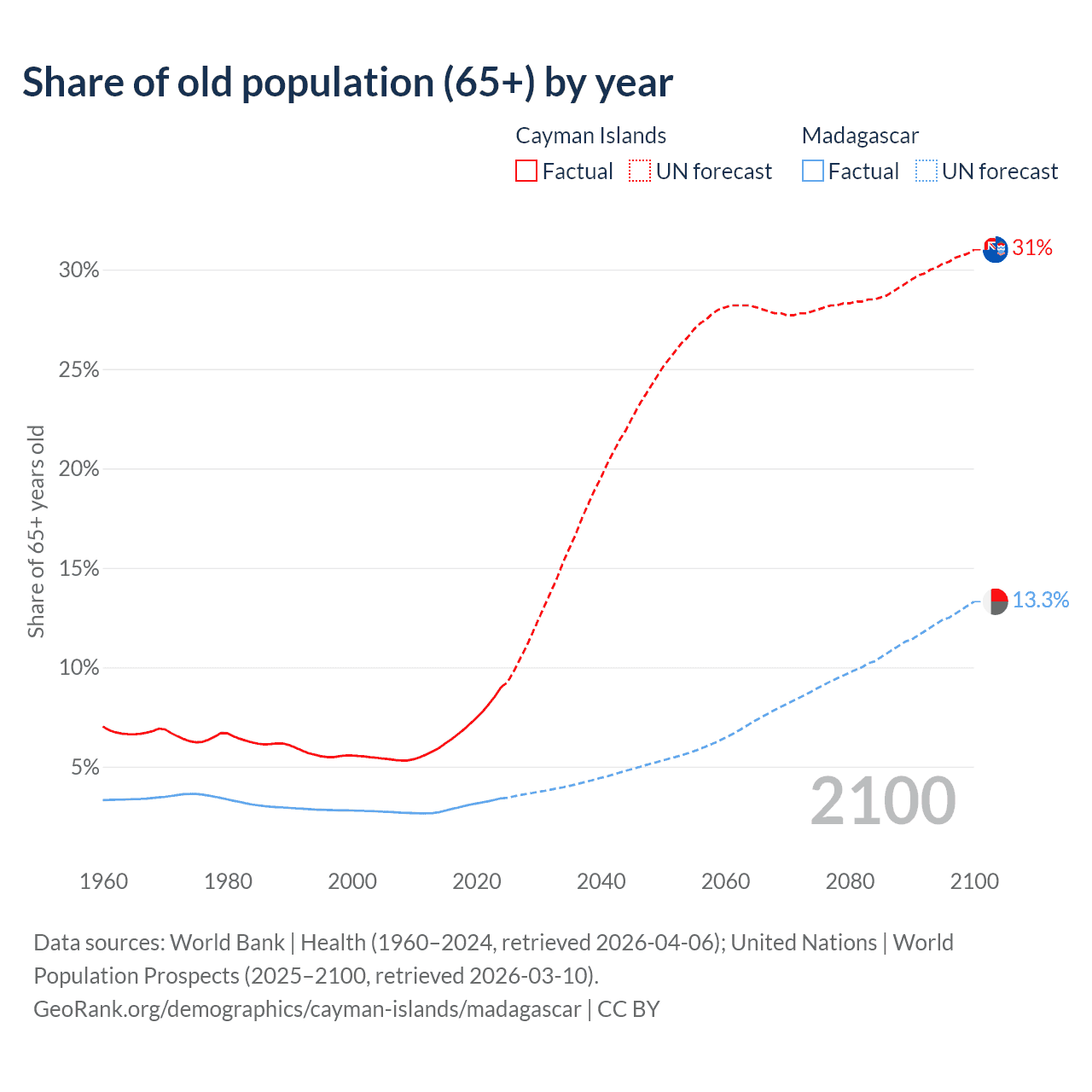 The share of older people aged 65 and over is 9% in the Cayman Islands and 3.41% in Madagascar. Life expectancy in the Cayman Islands compared to Madagascar .