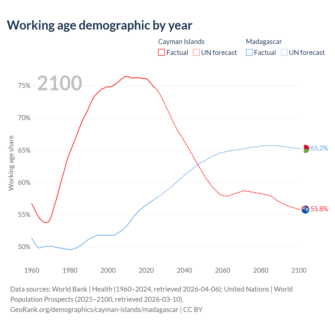 - The Cayman Islands has 58.1K working age adults (aged 15-64) vs 19.4M in Madagascar.