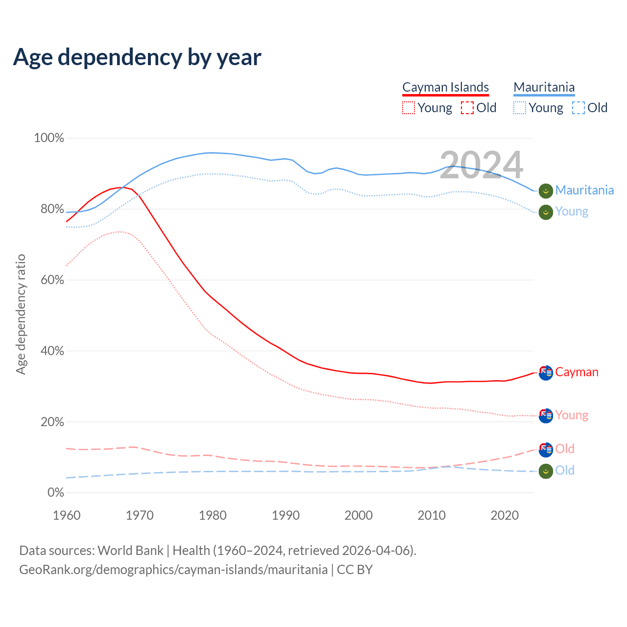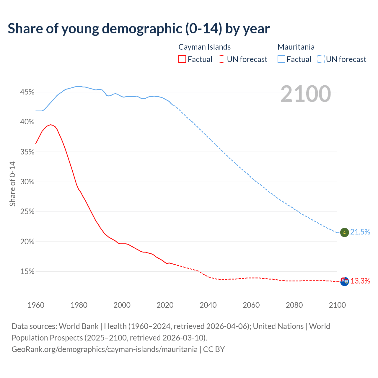 - The share of young demographic (0-15 years old) in the Cayman Islands is 16.2% vs 42.7% in Mauritania.