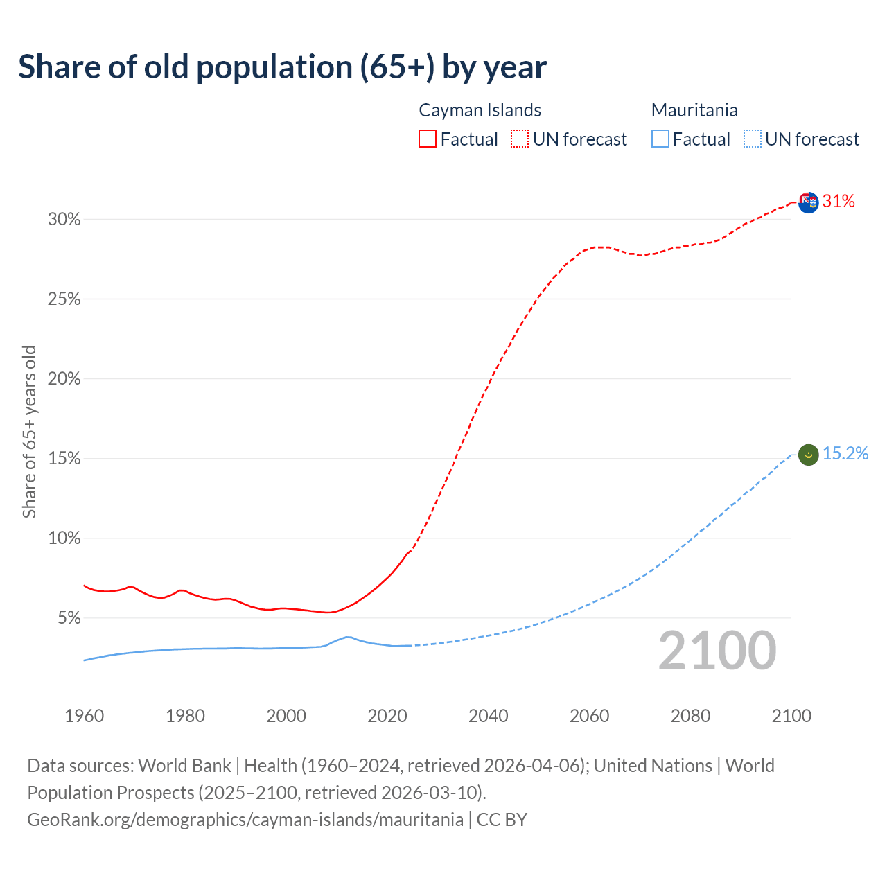 The share of older people aged 65 and over is 9% in the Cayman Islands and 3.23% in Mauritania. Life expectancy in the Cayman Islands compared to Mauritania .