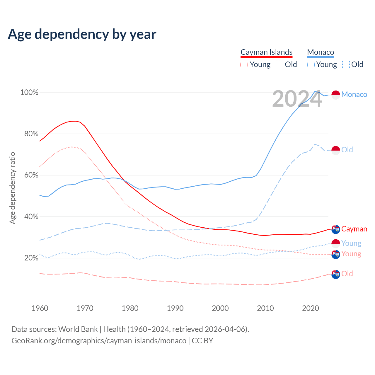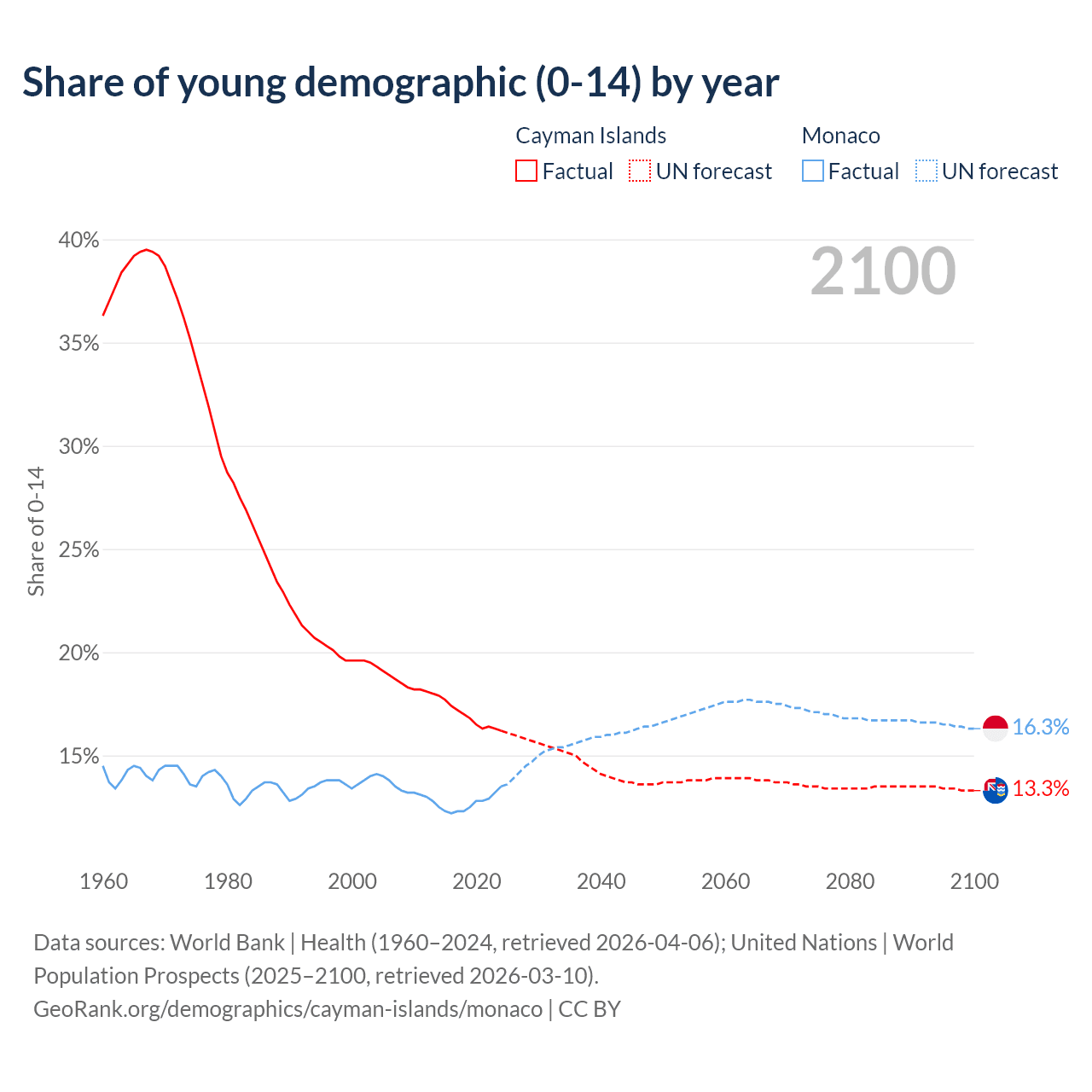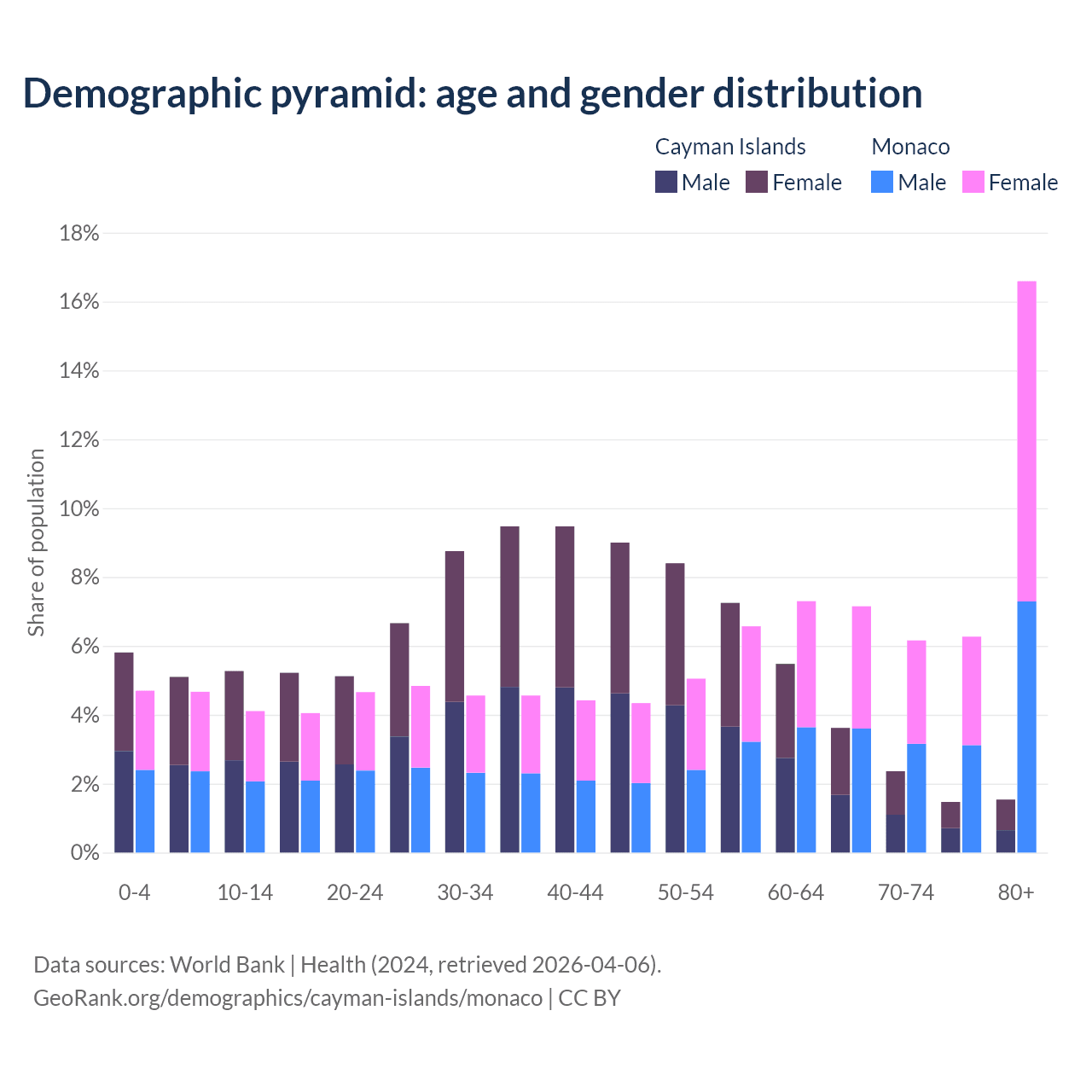 - The share of young demographic (0-15 years old) in the Cayman Islands is 16.2% vs 13.5% in Monaco.