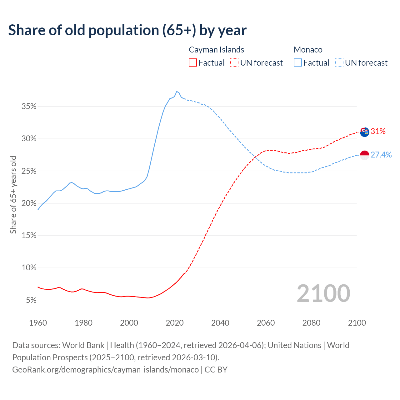 The share of older people aged 65 and over is 9% in the Cayman Islands and 36.2% in Monaco. Life expectancy in the Cayman Islands compared to Monaco .