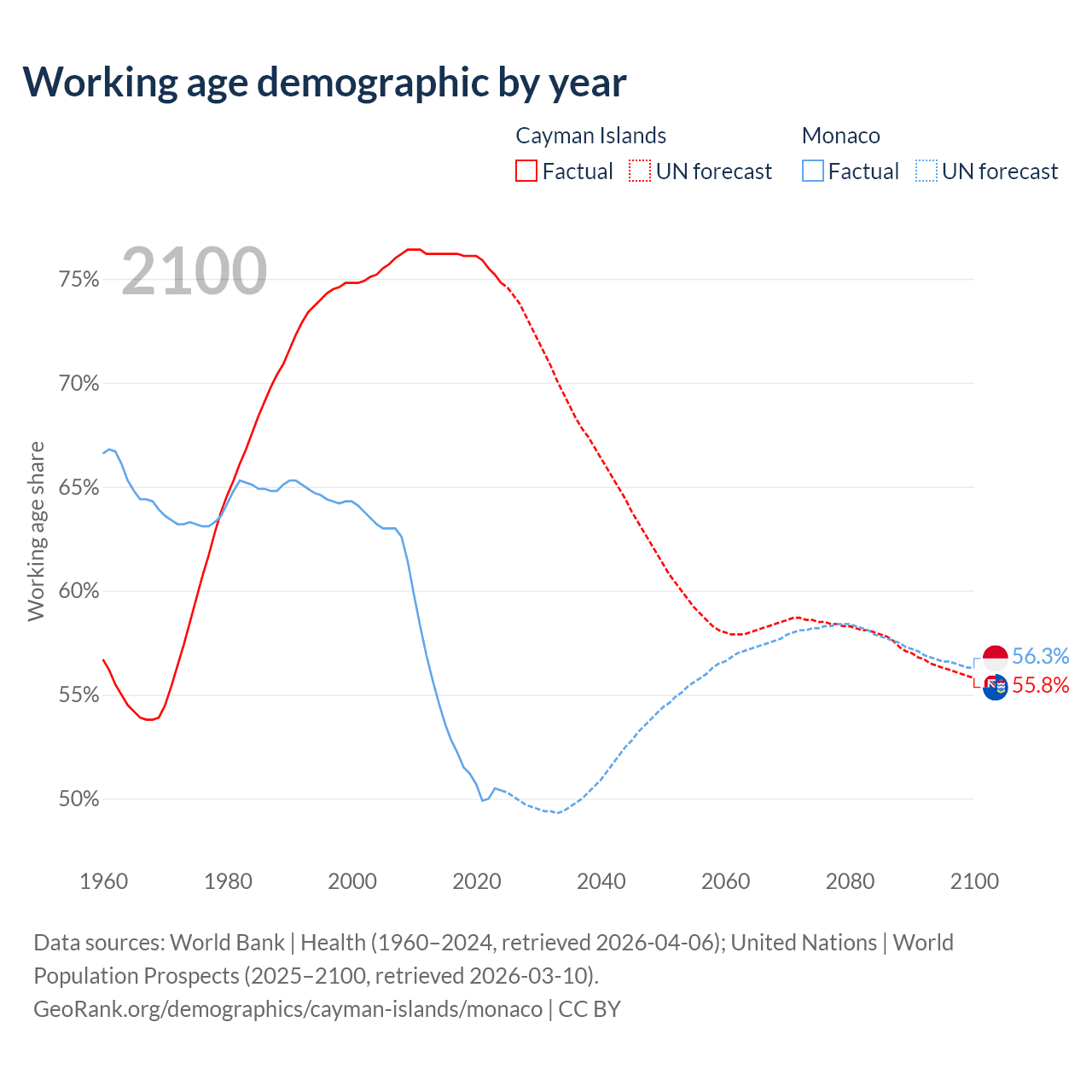 Median age Cayman Islands vs Monaco, 1960-2100