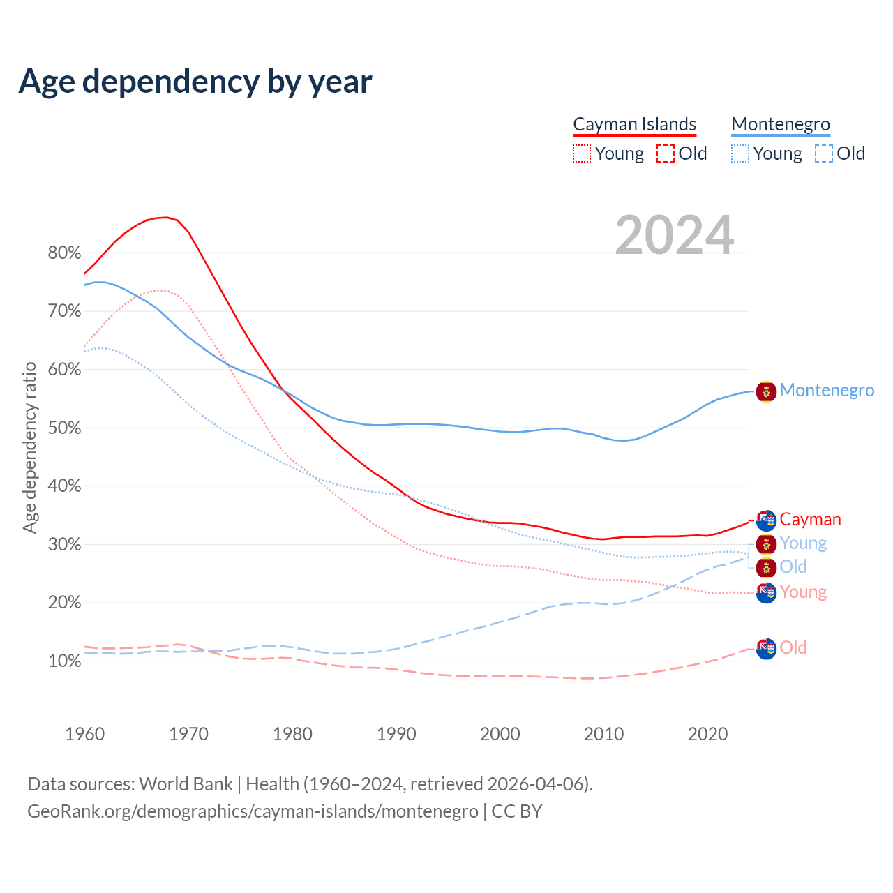- The share of old-age demographic (65+) in the Cayman Islands is 9% vs 17.8% in Montenegro.