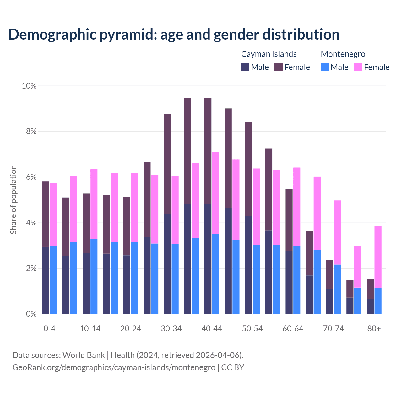- As of 2026, the population of the Cayman Islands is 77.6K vs 612K in Montenegro - 7.89 times difference.