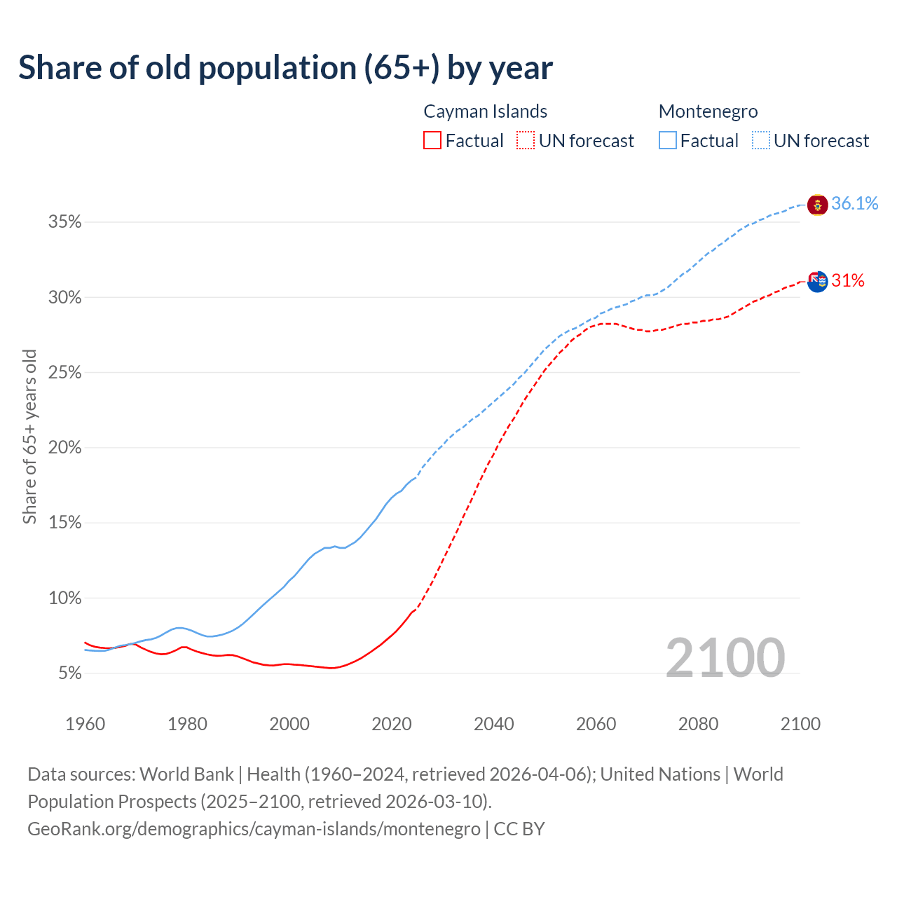 The share of older people aged 65 and over is 9% in the Cayman Islands and 17.8% in Montenegro. Life expectancy in the Cayman Islands compared to Montenegro .