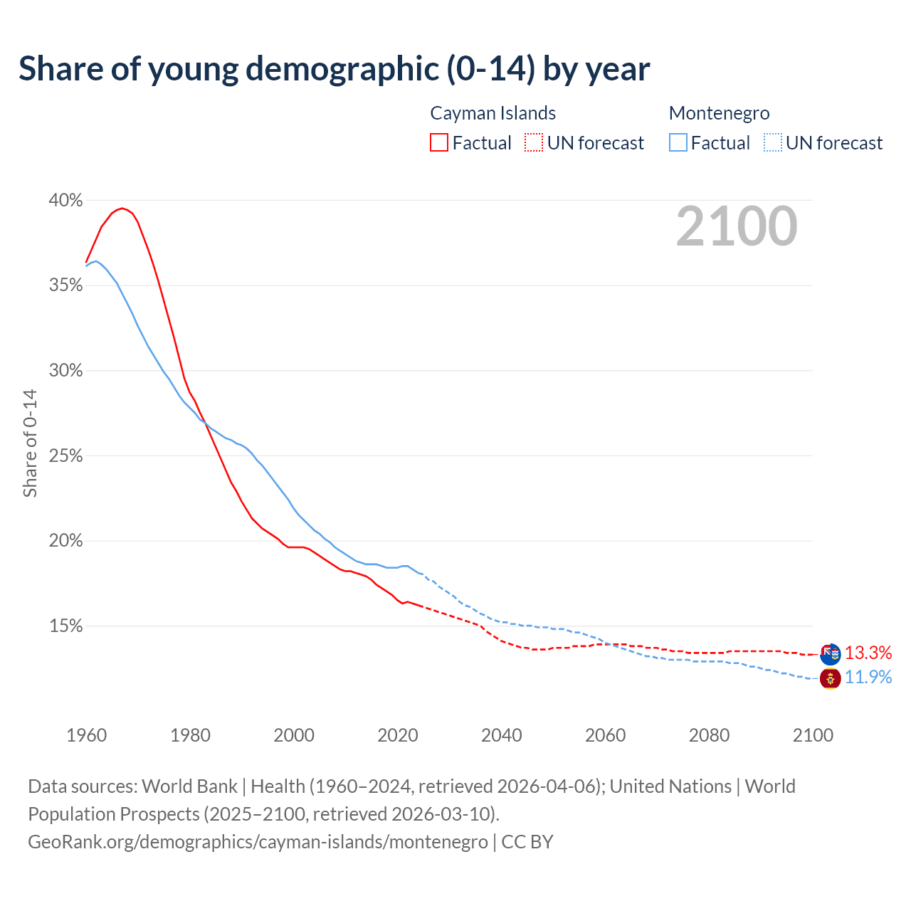 - The share of young demographic (0-15 years old) in the Cayman Islands is 16.2% vs 18.1% in Montenegro.