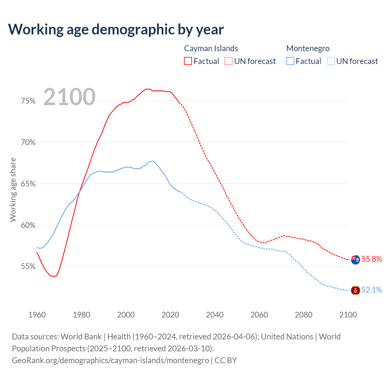 - The Cayman Islands has 58.1K working age adults (aged 15-64) vs 392K in Montenegro.