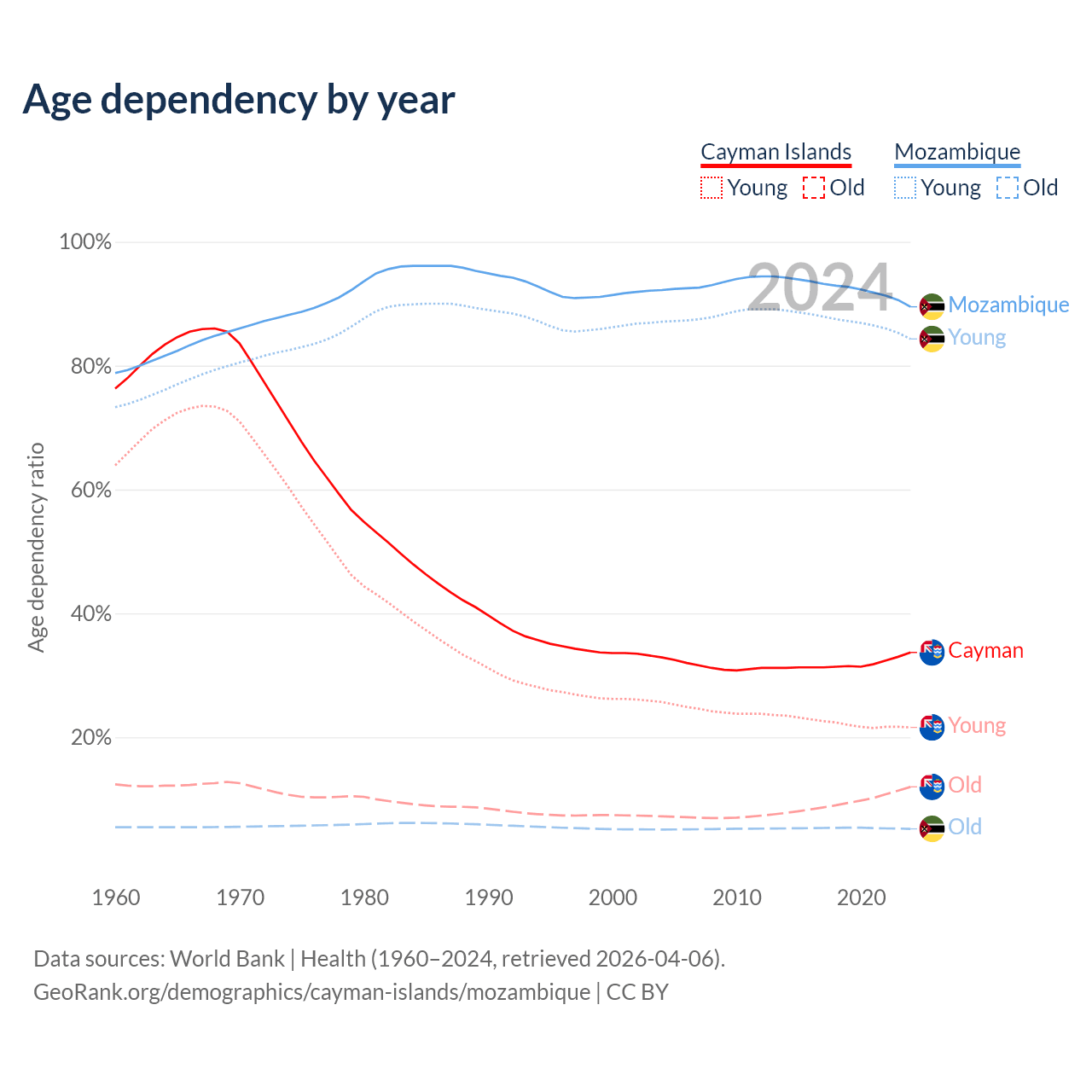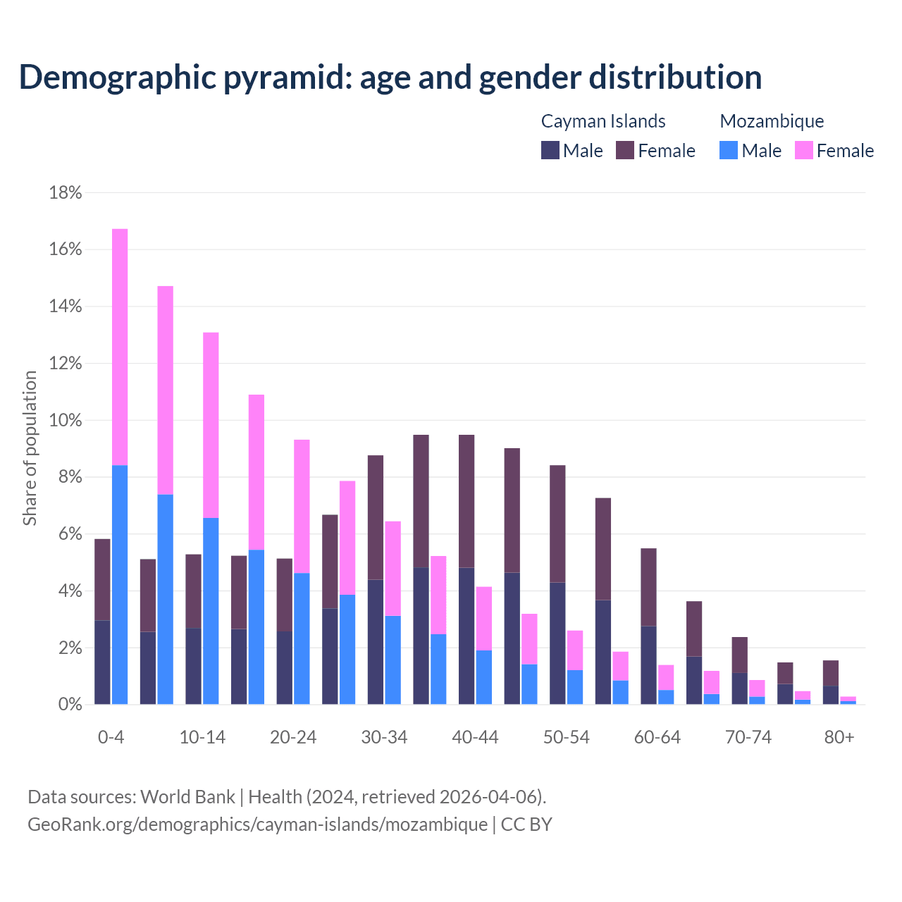 - The share of young demographic (0-15 years old) in the Cayman Islands is 16.2% vs 44.5% in Mozambique.