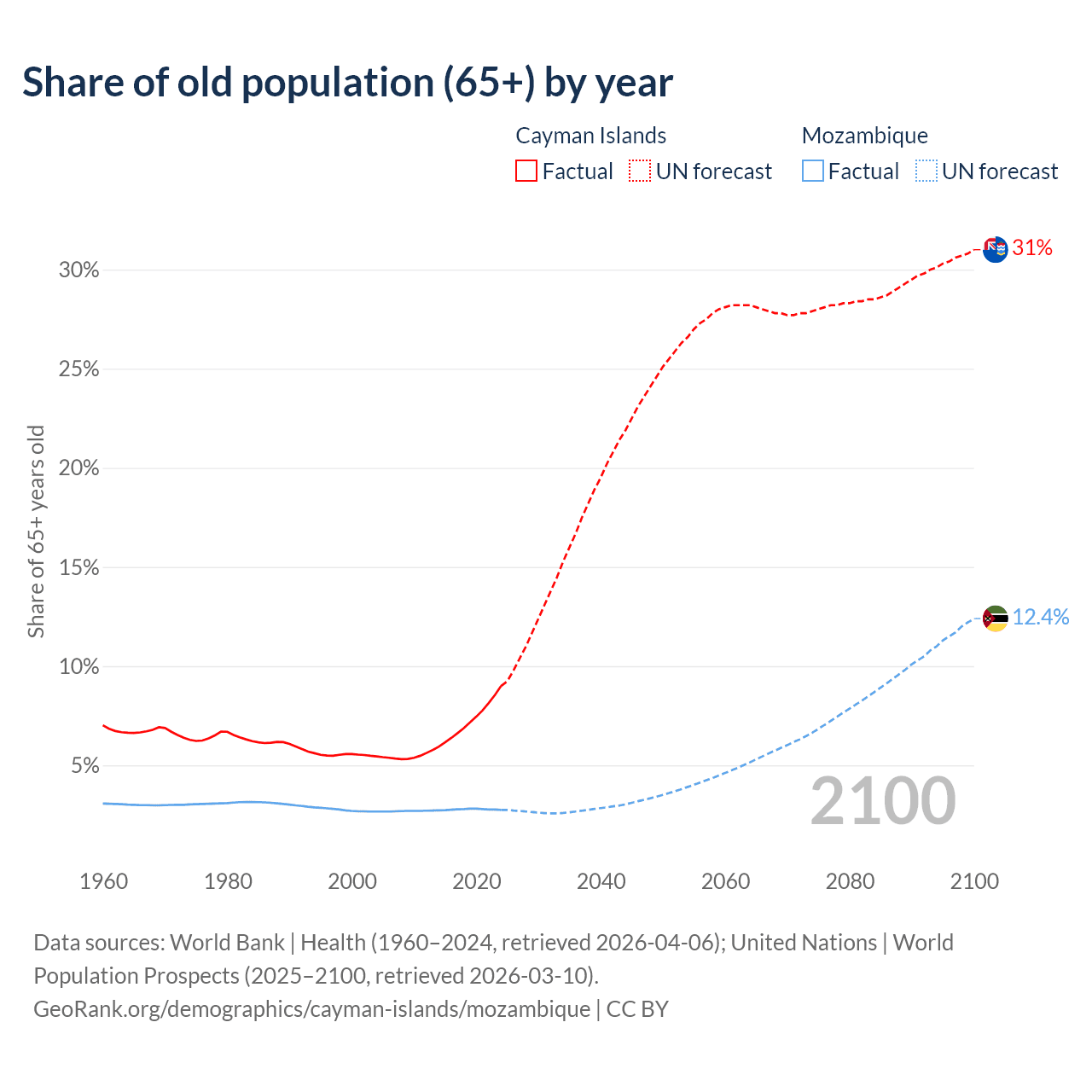 - The share of old-age demographic (65+) in the Cayman Islands is 9% vs 2.75% in Mozambique.