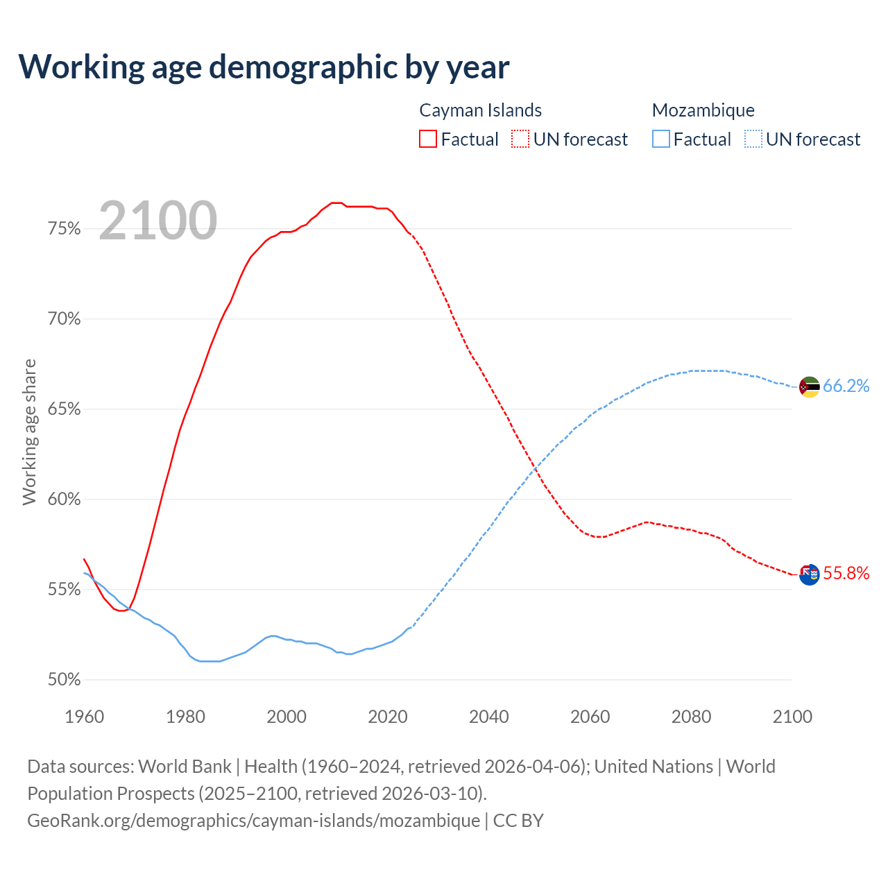 - The Cayman Islands has 58.1K working age adults (aged 15-64) vs 19.5M in Mozambique.