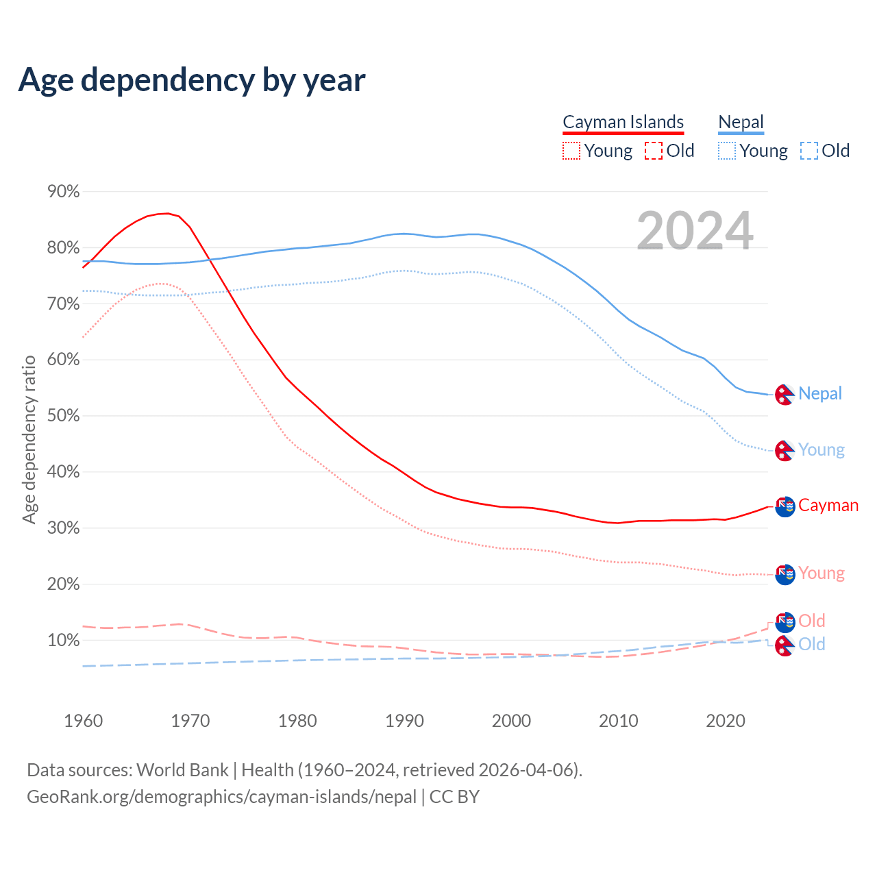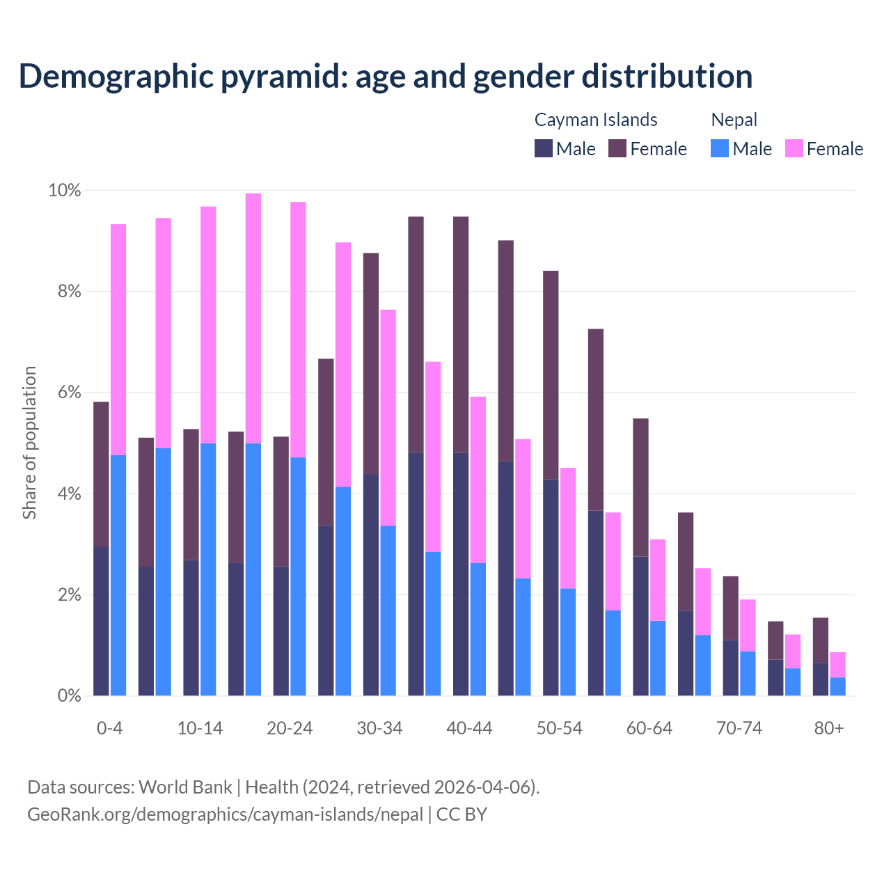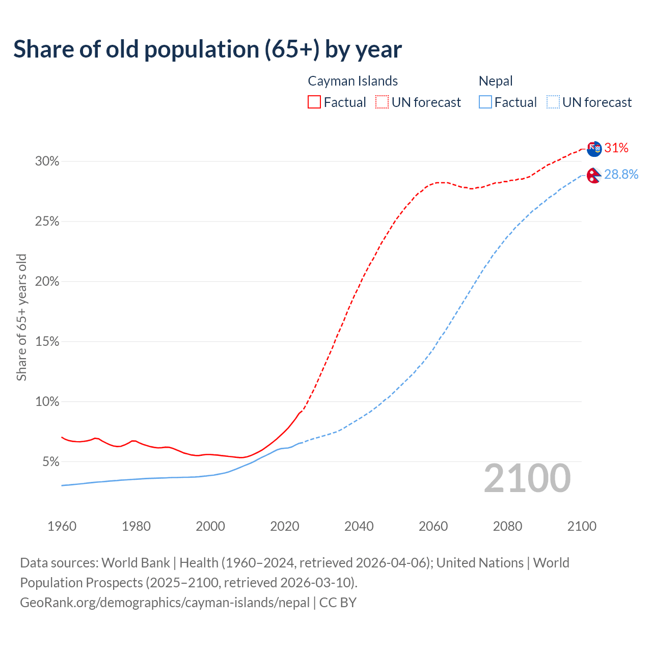 The share of older people aged 65 and over is 9% in the Cayman Islands and 6.5% in Nepal. Life expectancy in the Cayman Islands compared to Nepal .