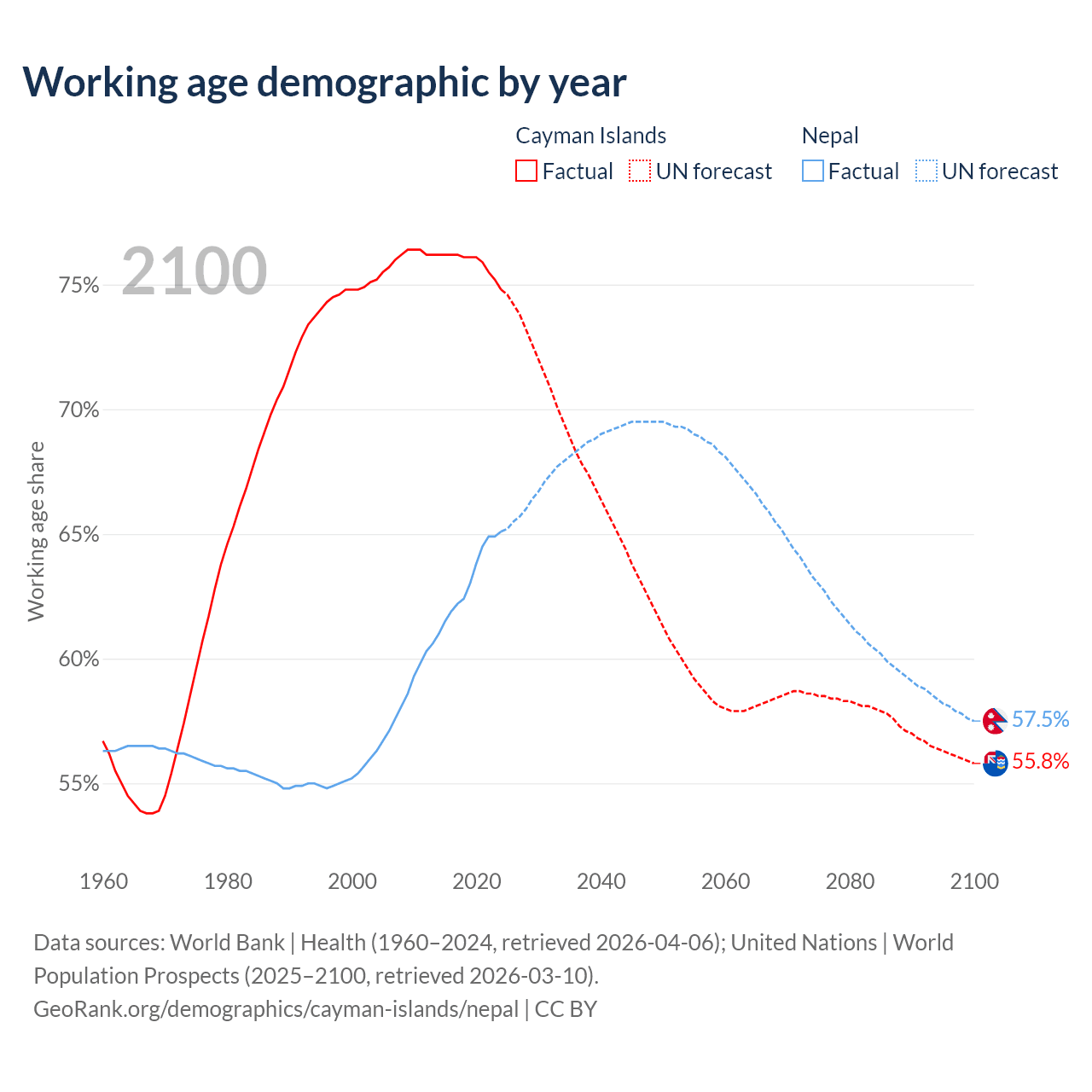 - The Cayman Islands has 58.1K working age adults (aged 15-64) vs 19.3M in Nepal.