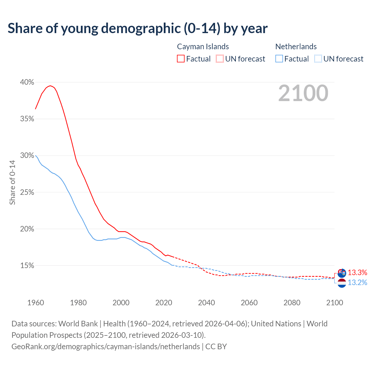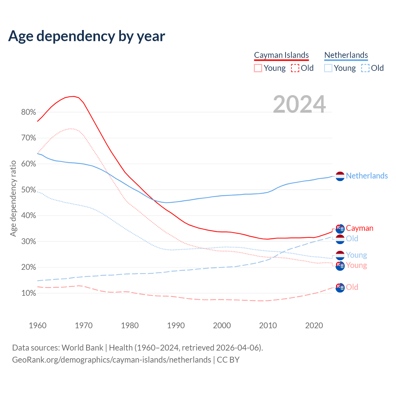 - The share of young demographic (0-15 years old) in the Cayman Islands is 16.2% vs 15% in the Netherlands.