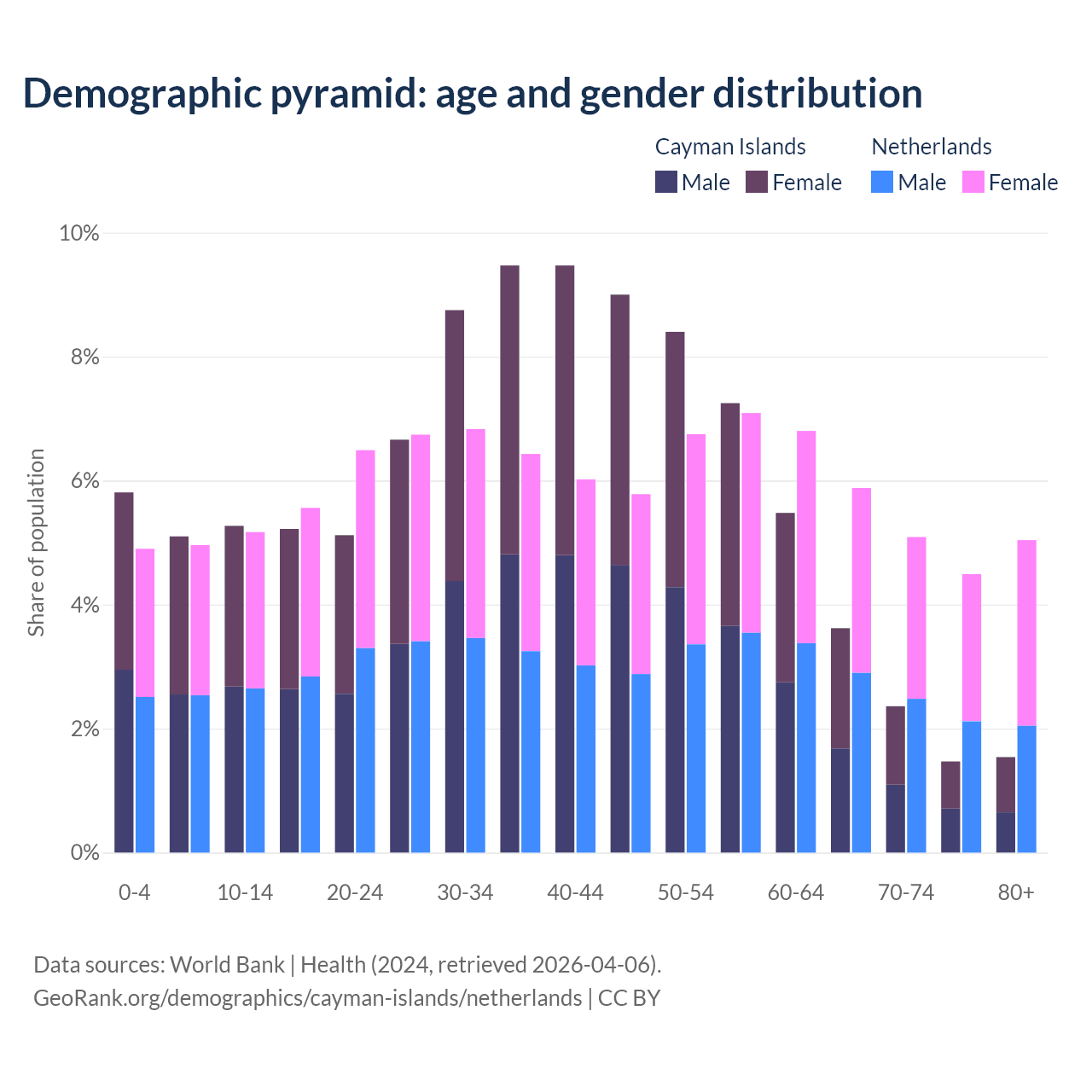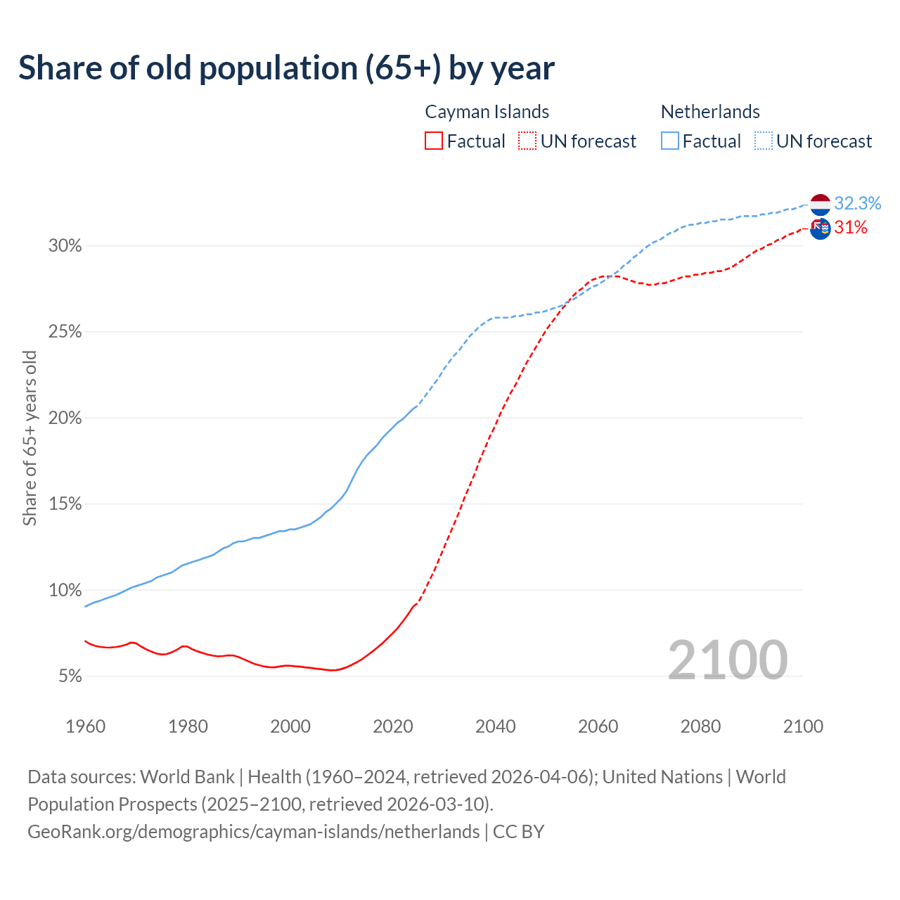 The share of older people aged 65 and over is 9% in the Cayman Islands and 20.5% in the Netherlands. Life expectancy in the Cayman Islands compared to the Netherlands .