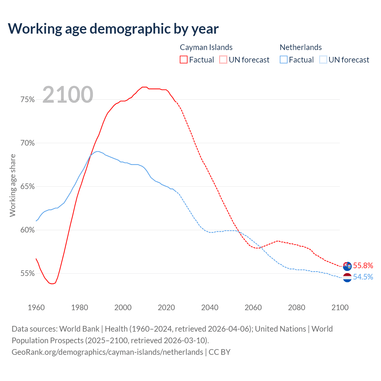 - The Cayman Islands has 58.1K working age adults (aged 15-64) vs 11.8M in the Netherlands.