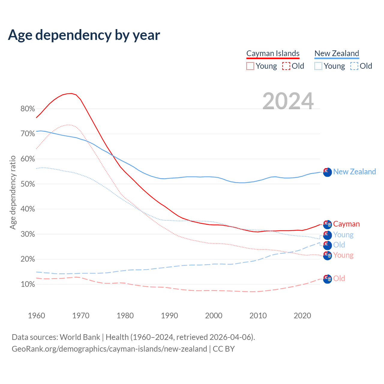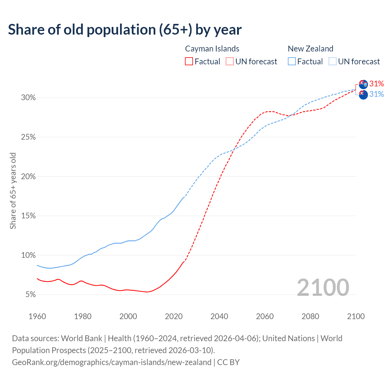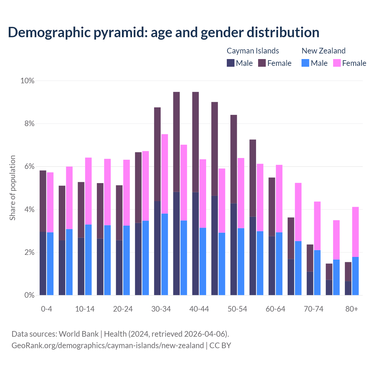 The share of older people aged 65 and over is 9% in the Cayman Islands and 17.2% in New Zealand. Life expectancy in the Cayman Islands compared to New Zealand .