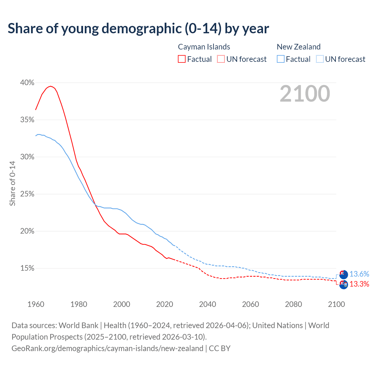 - The share of young demographic (0-15 years old) in the Cayman Islands is 16.2% vs 18.1% in New Zealand.