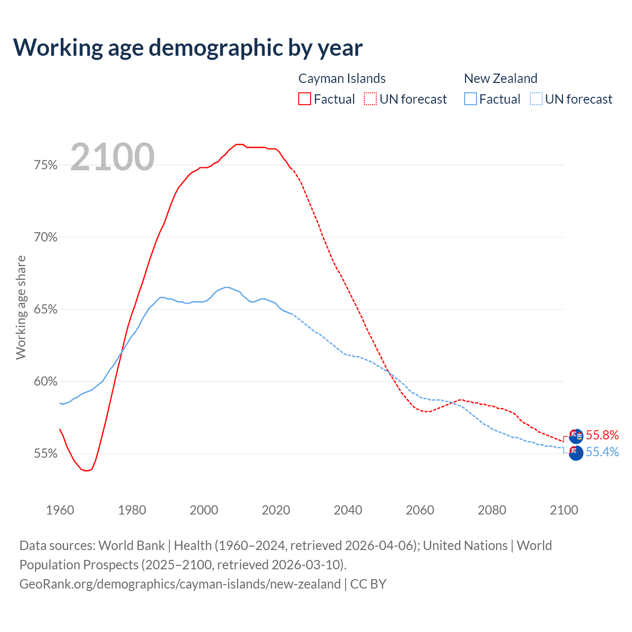 Median age Cayman Islands vs New Zealand, 1960-2100