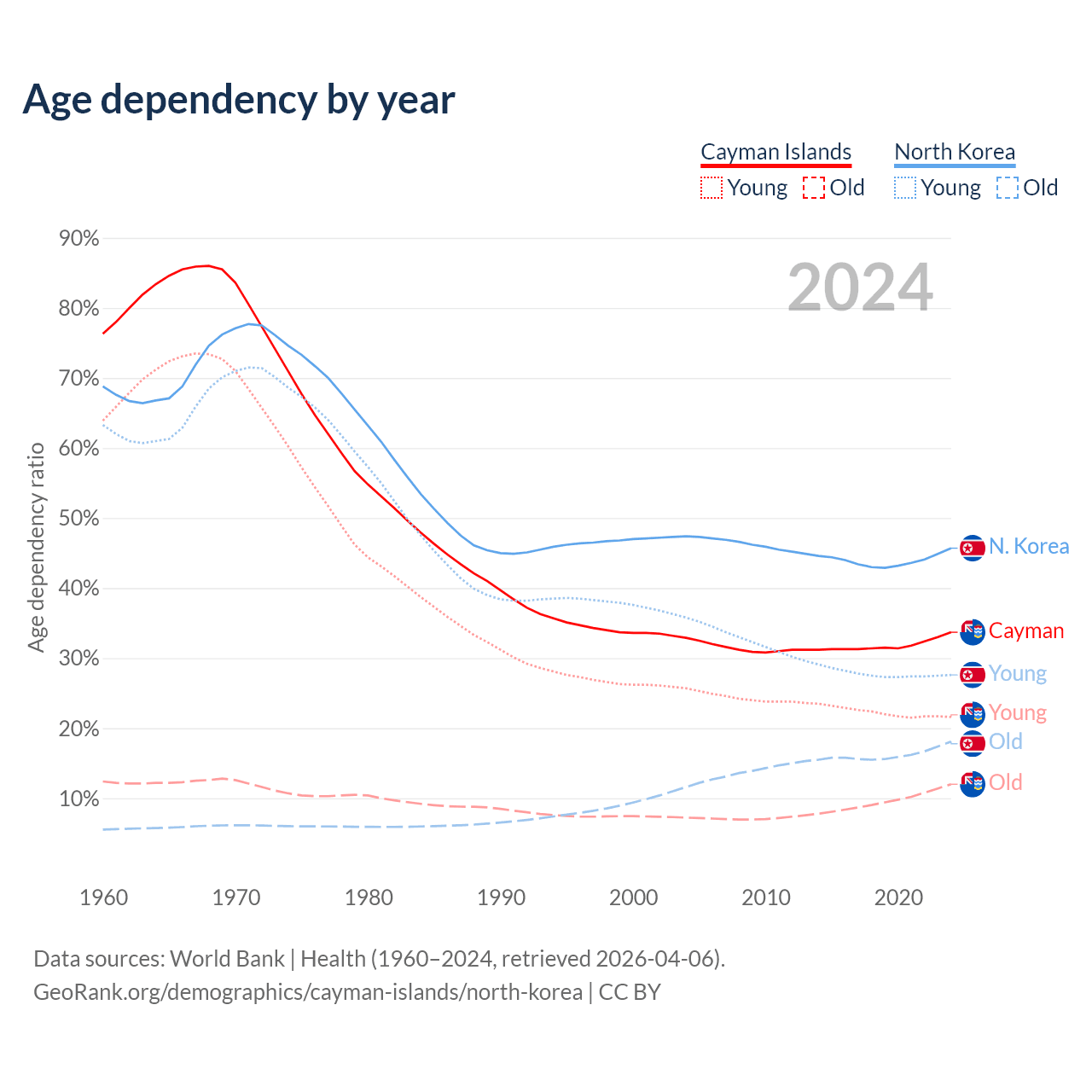 - The share of old-age demographic (65+) in the Cayman Islands is 9% vs 12.4% in North Korea.