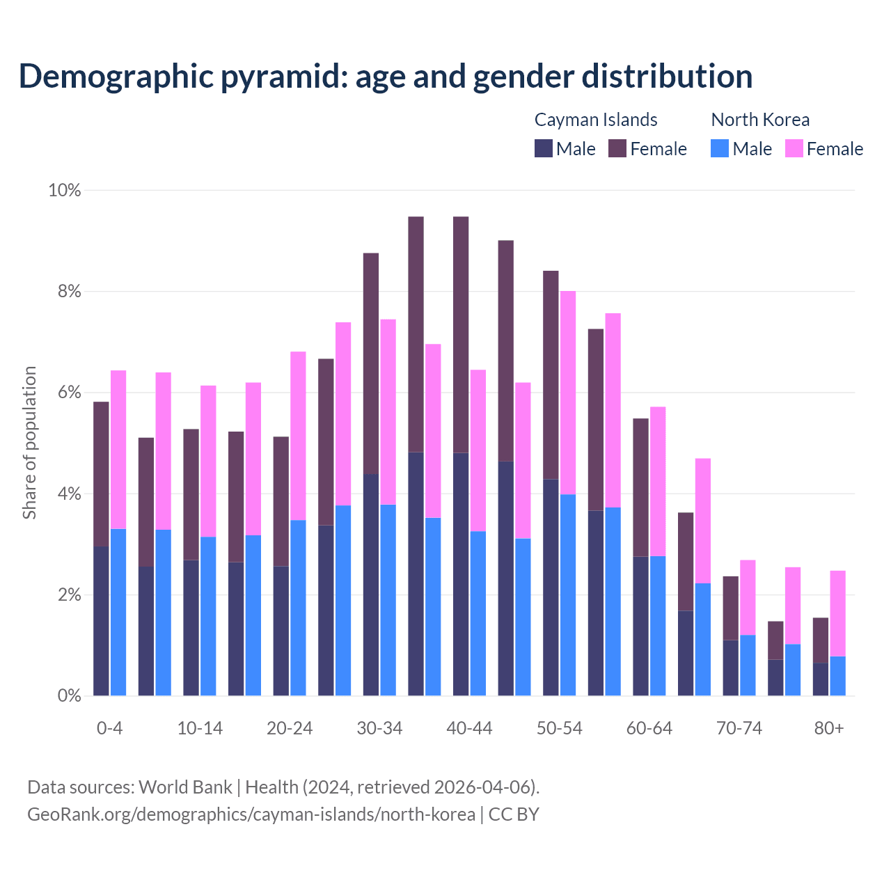 The share of older people aged 65 and over is 9% in the Cayman Islands and 12.4% in North Korea. Life expectancy in the Cayman Islands compared to North Korea .
