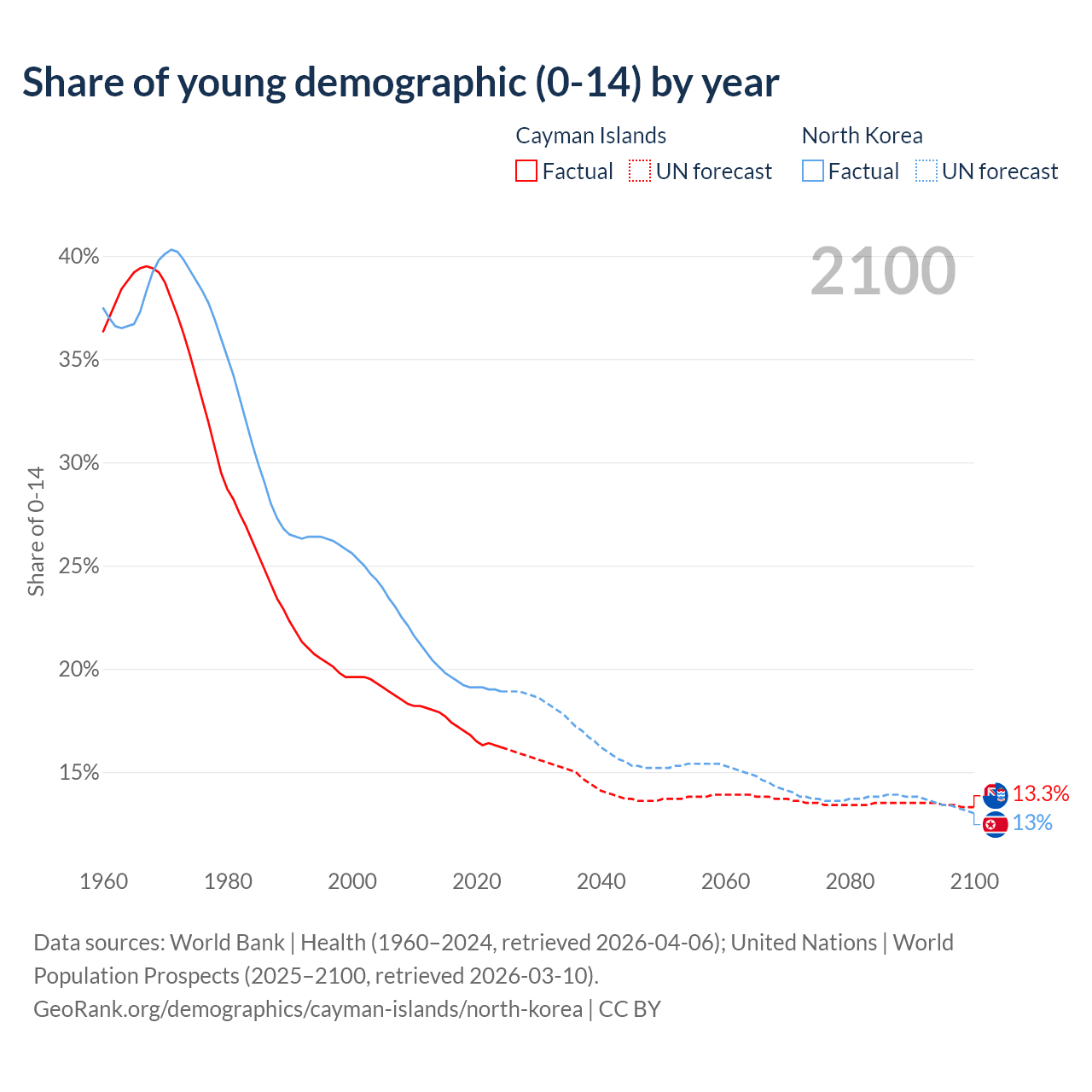 - The share of young demographic (0-15 years old) in the Cayman Islands is 16.2% vs 18.9% in North Korea.