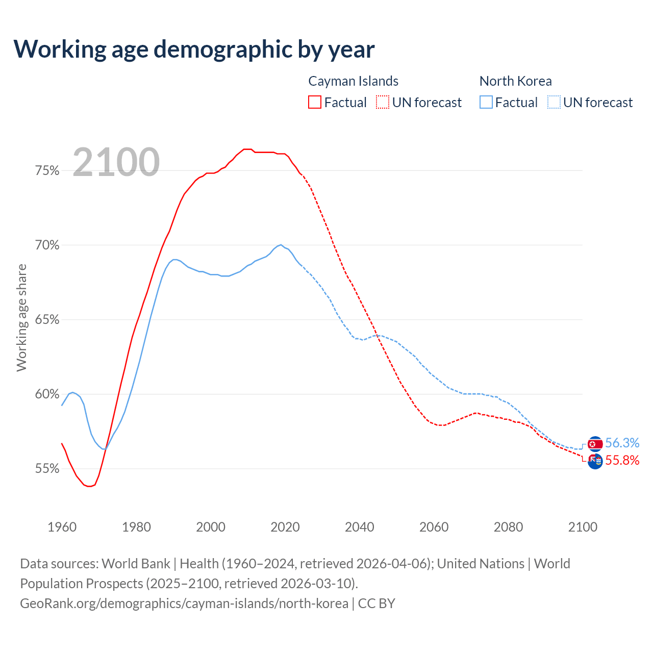 - The Cayman Islands has 58.1K working age adults (aged 15-64) vs 18.3M in North Korea.