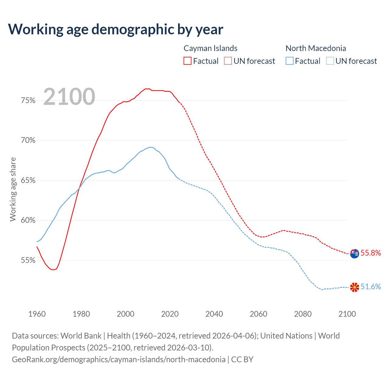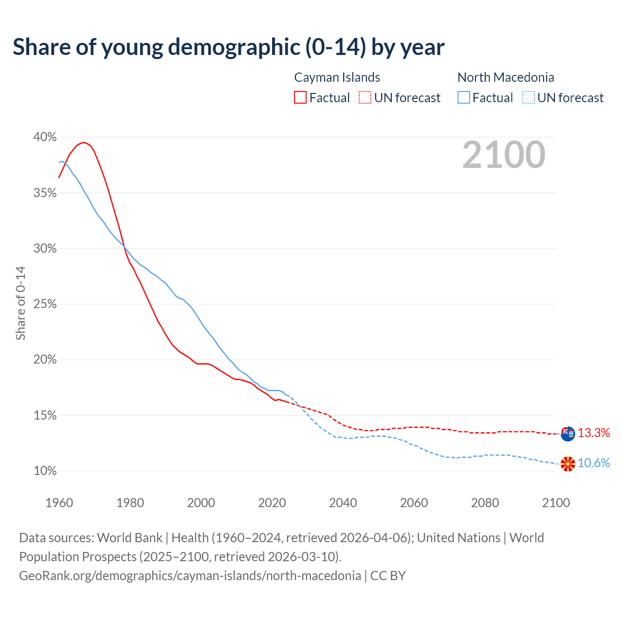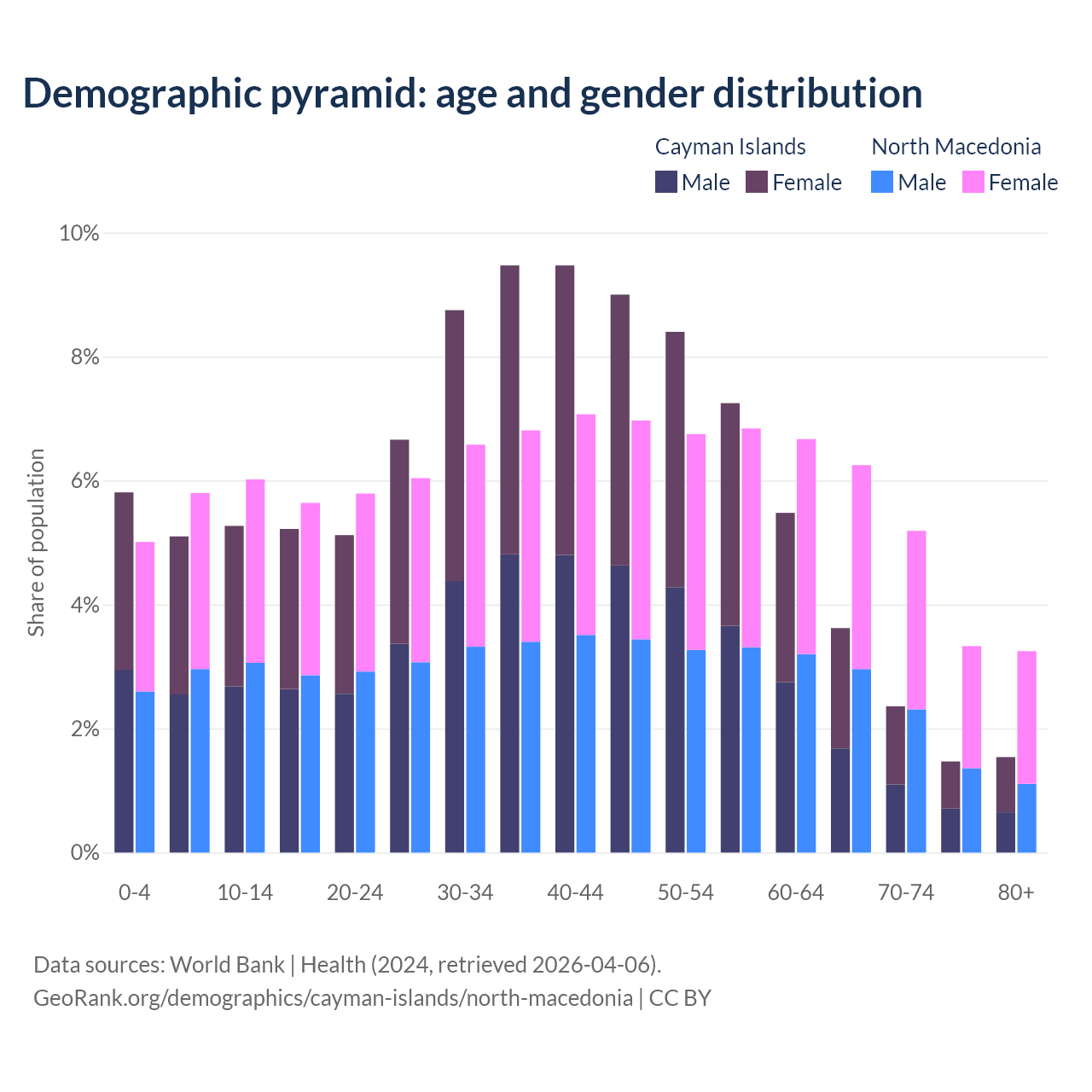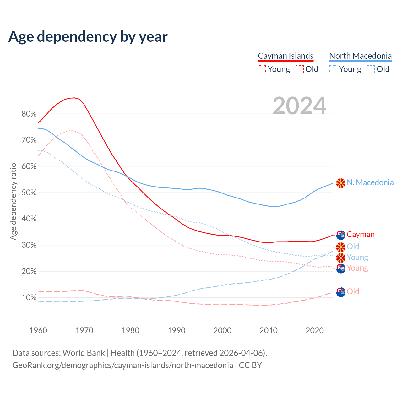 - The share of young demographic (0-15 years old) in the Cayman Islands is 16.2% vs 16.8% in North Macedonia.