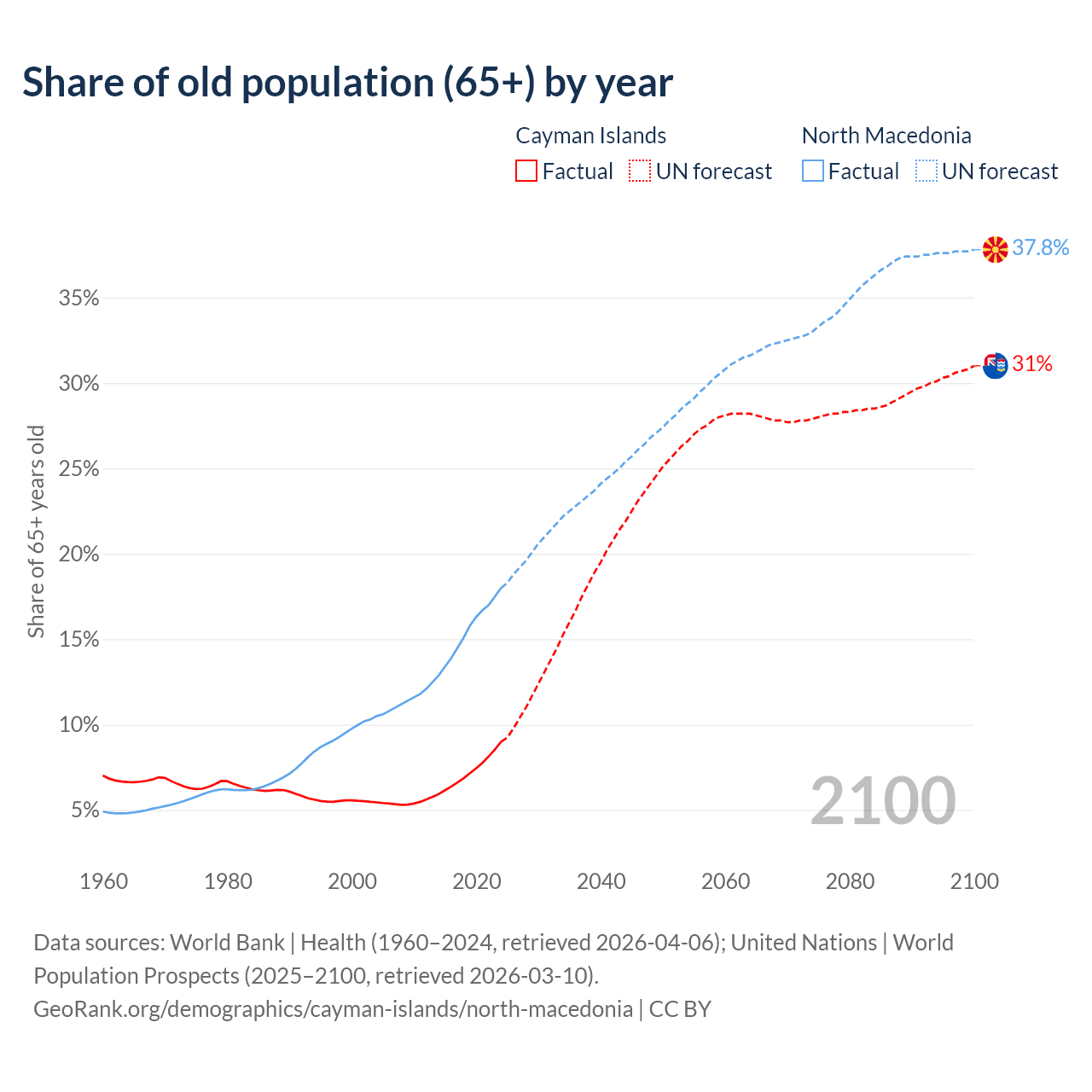 The share of older people aged 65 and over is 9% in the Cayman Islands and 18% in North Macedonia. Life expectancy in the Cayman Islands compared to North Macedonia .