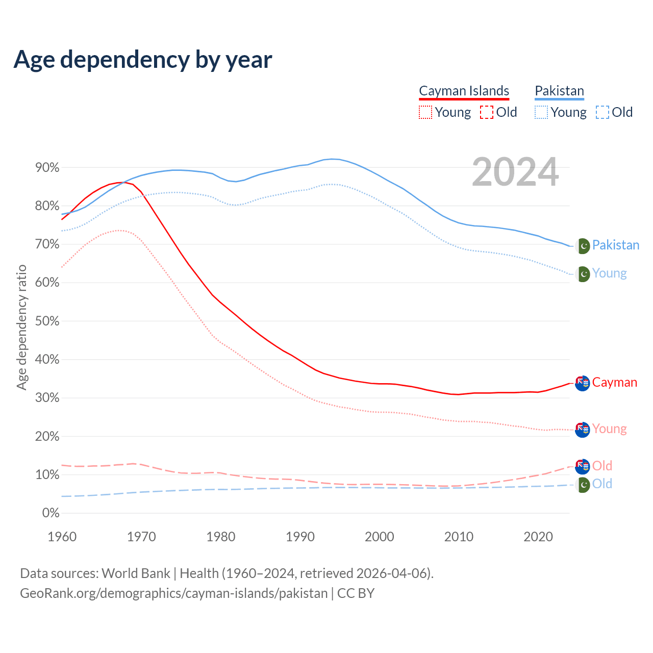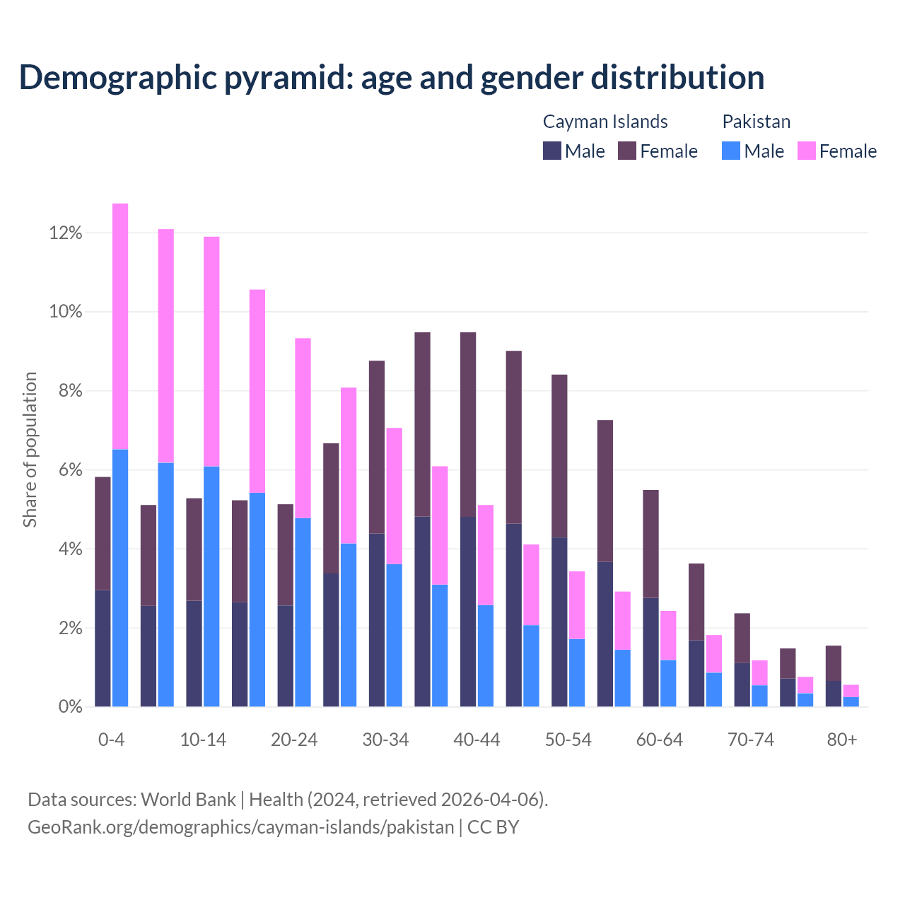 - The Cayman Islands is ranked 51/196 by median age (oldest to youngest) vs 154/196 for Pakistan.