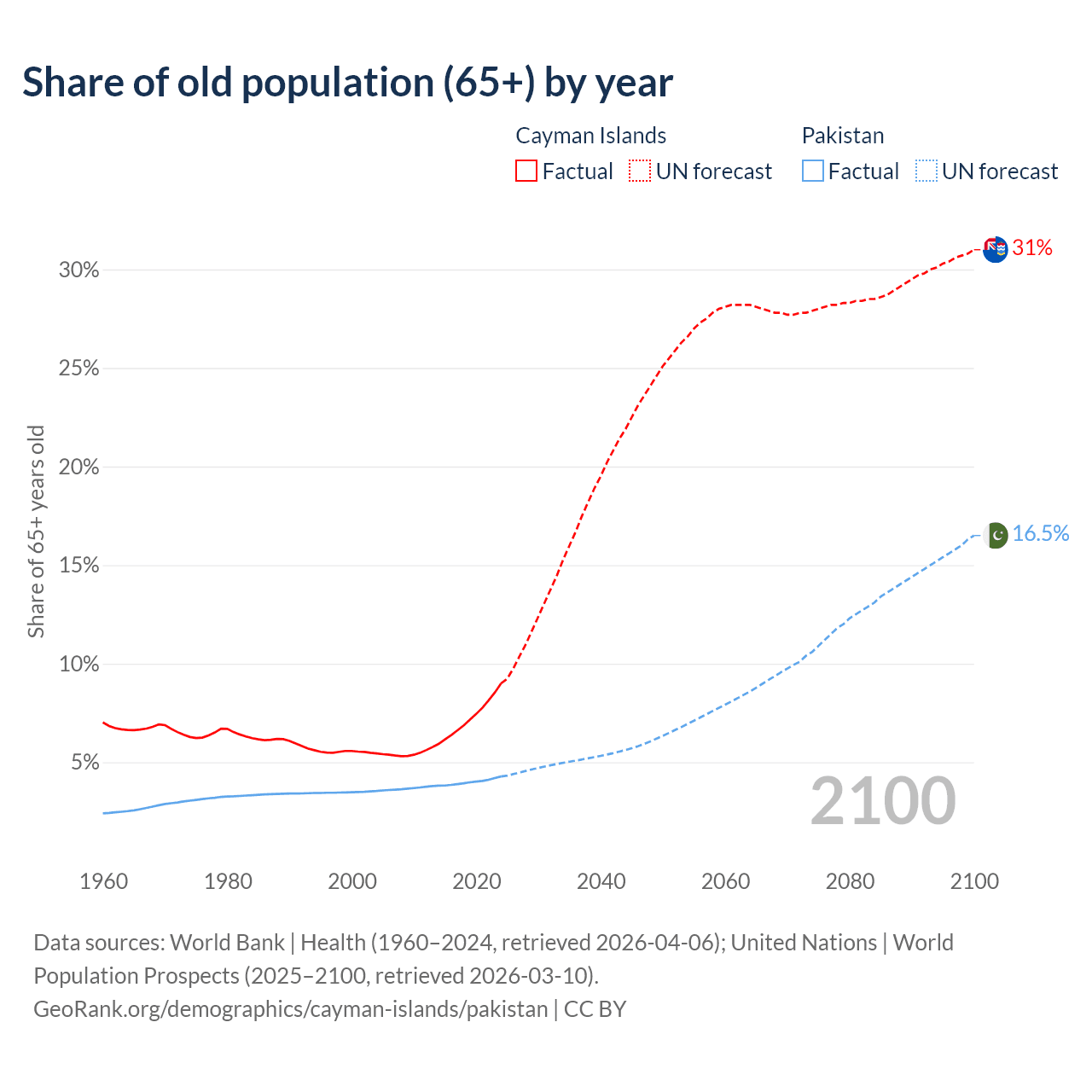 The share of older people aged 65 and over is 9% in the Cayman Islands and 4.28% in Pakistan. Life expectancy in the Cayman Islands compared to Pakistan .