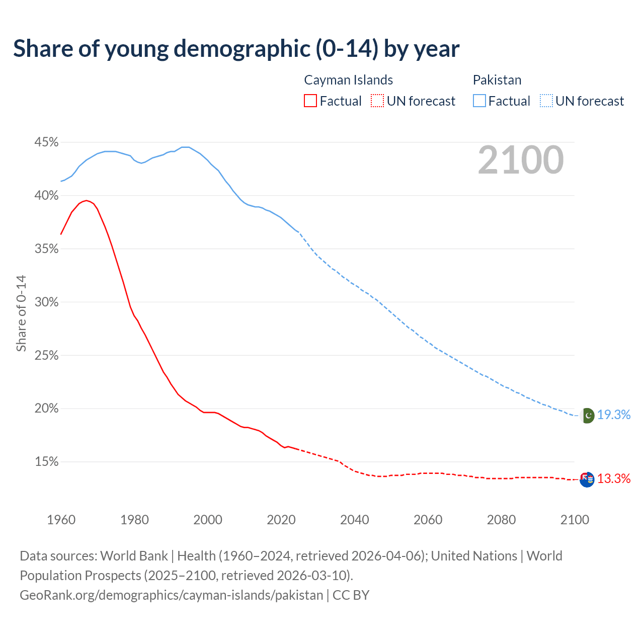 - The share of young demographic (0-15 years old) in the Cayman Islands is 16.2% vs 36.7% in Pakistan.