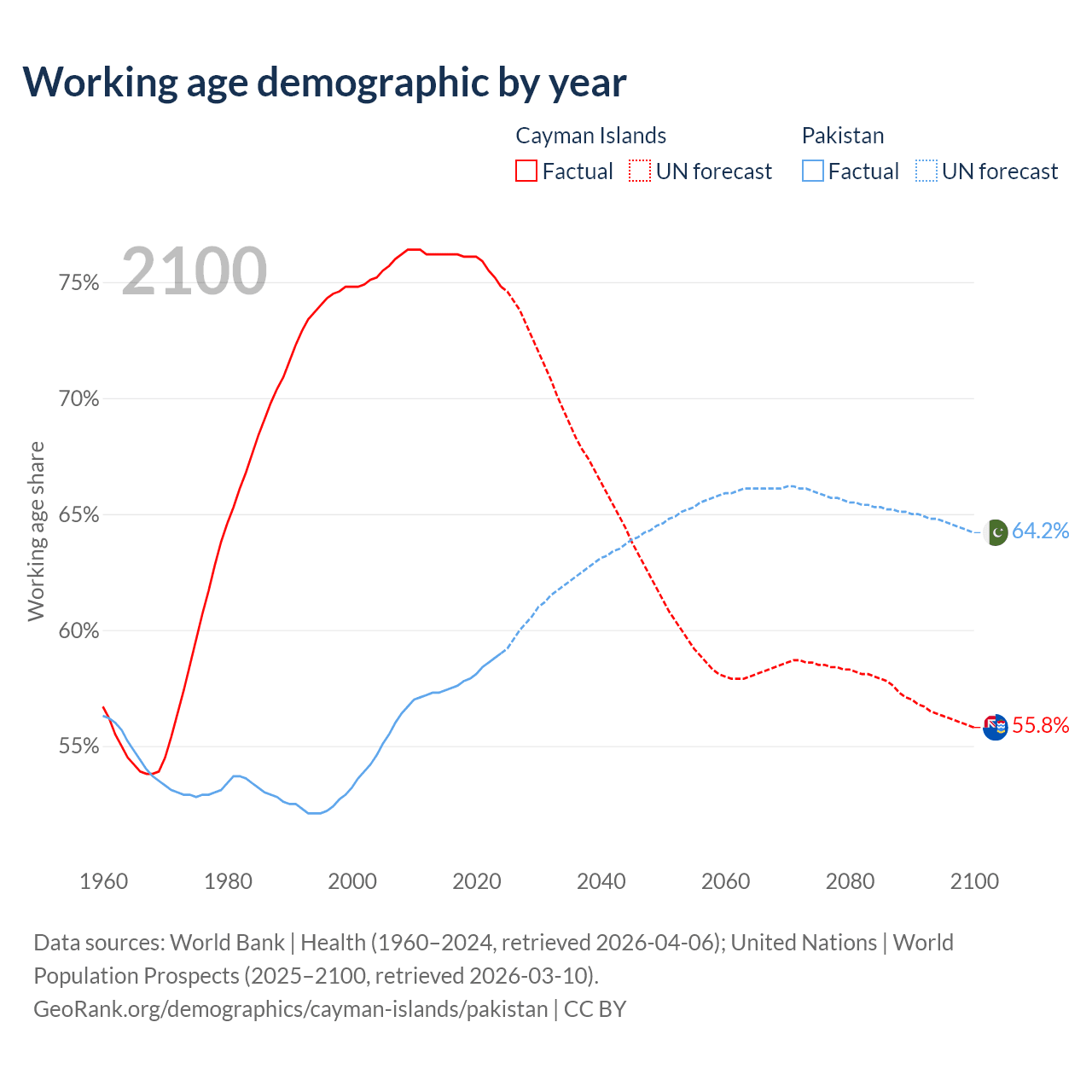 - The Cayman Islands has 58.1K working age adults (aged 15-64) vs 154M in Pakistan.