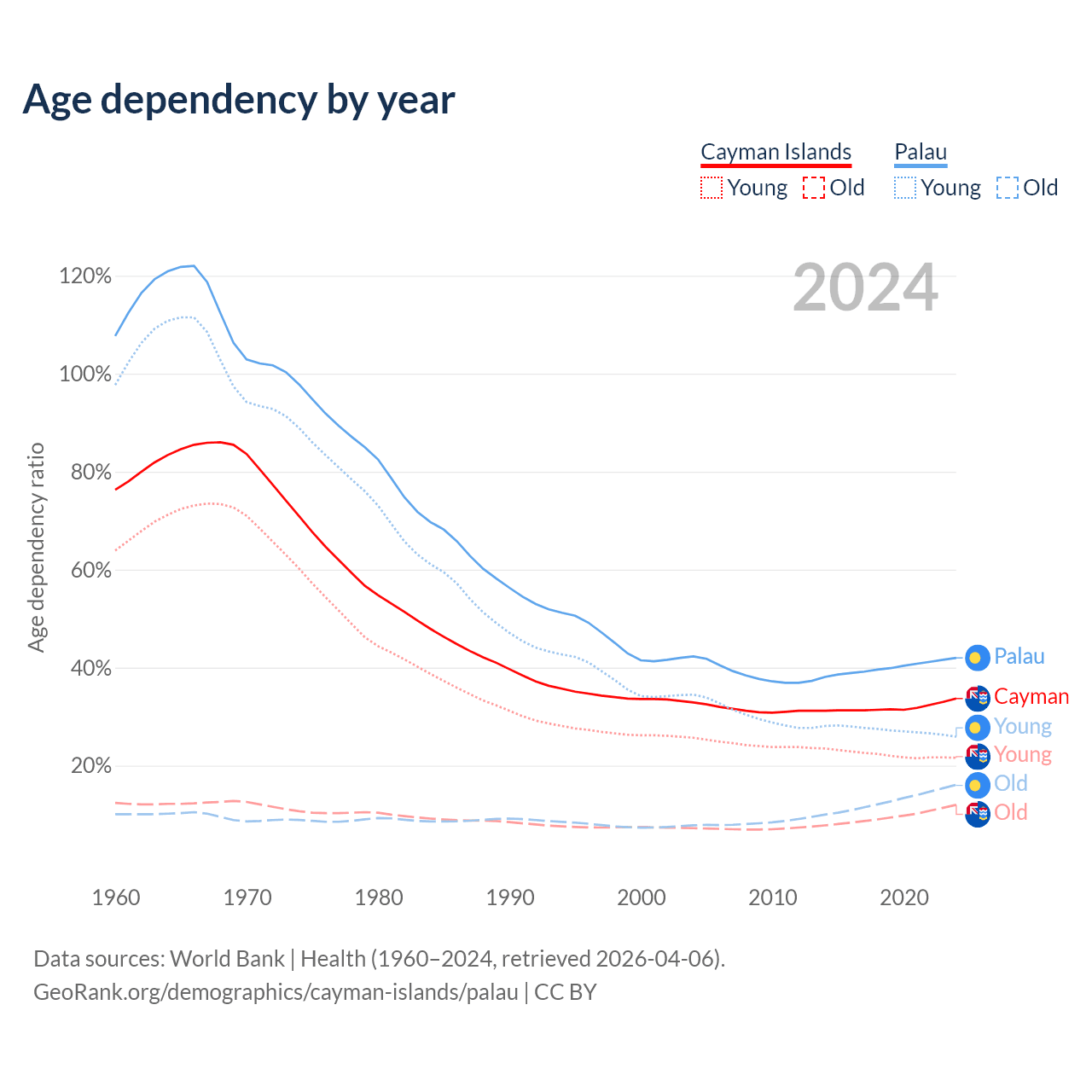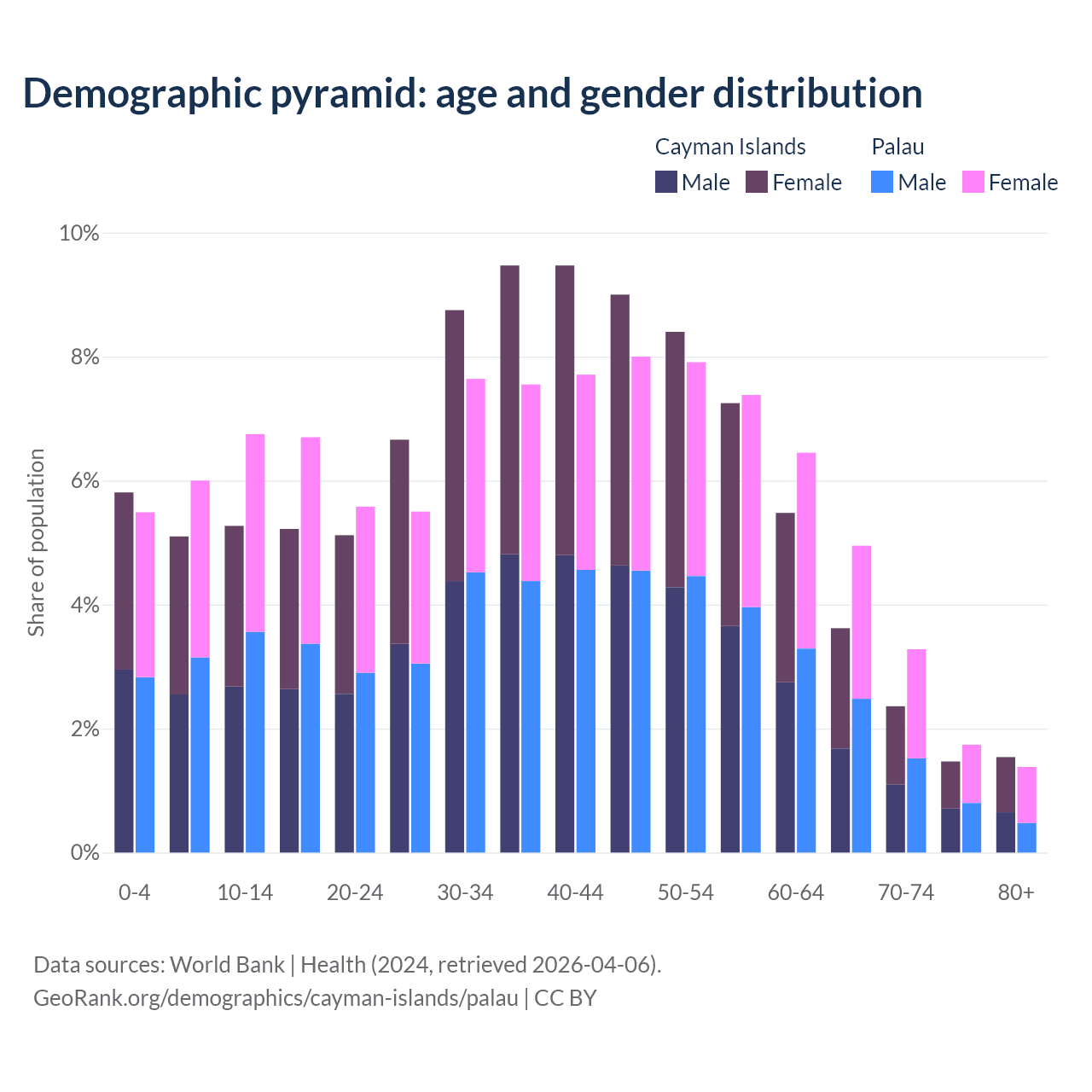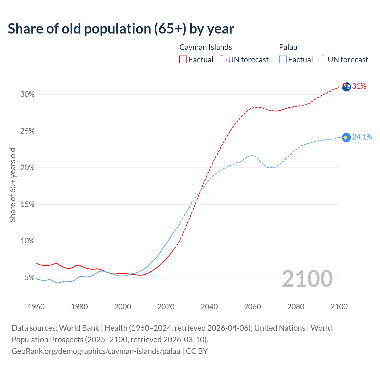 The share of older people aged 65 and over is 9% in the Cayman Islands and 11.3% in Palau. Life expectancy in the Cayman Islands compared to Palau .