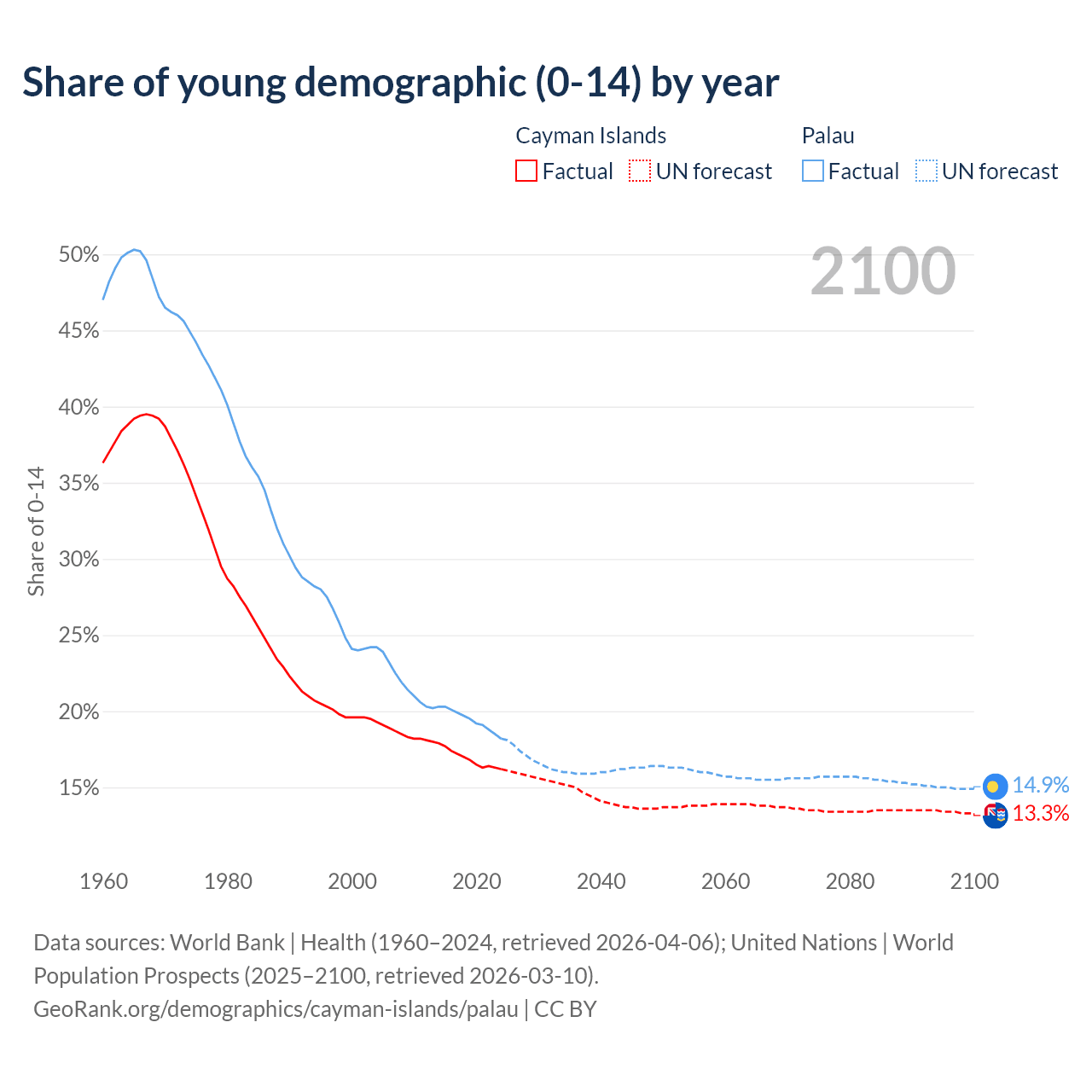 - The share of young demographic (0-15 years old) in the Cayman Islands is 16.2% vs 18.2% in Palau.