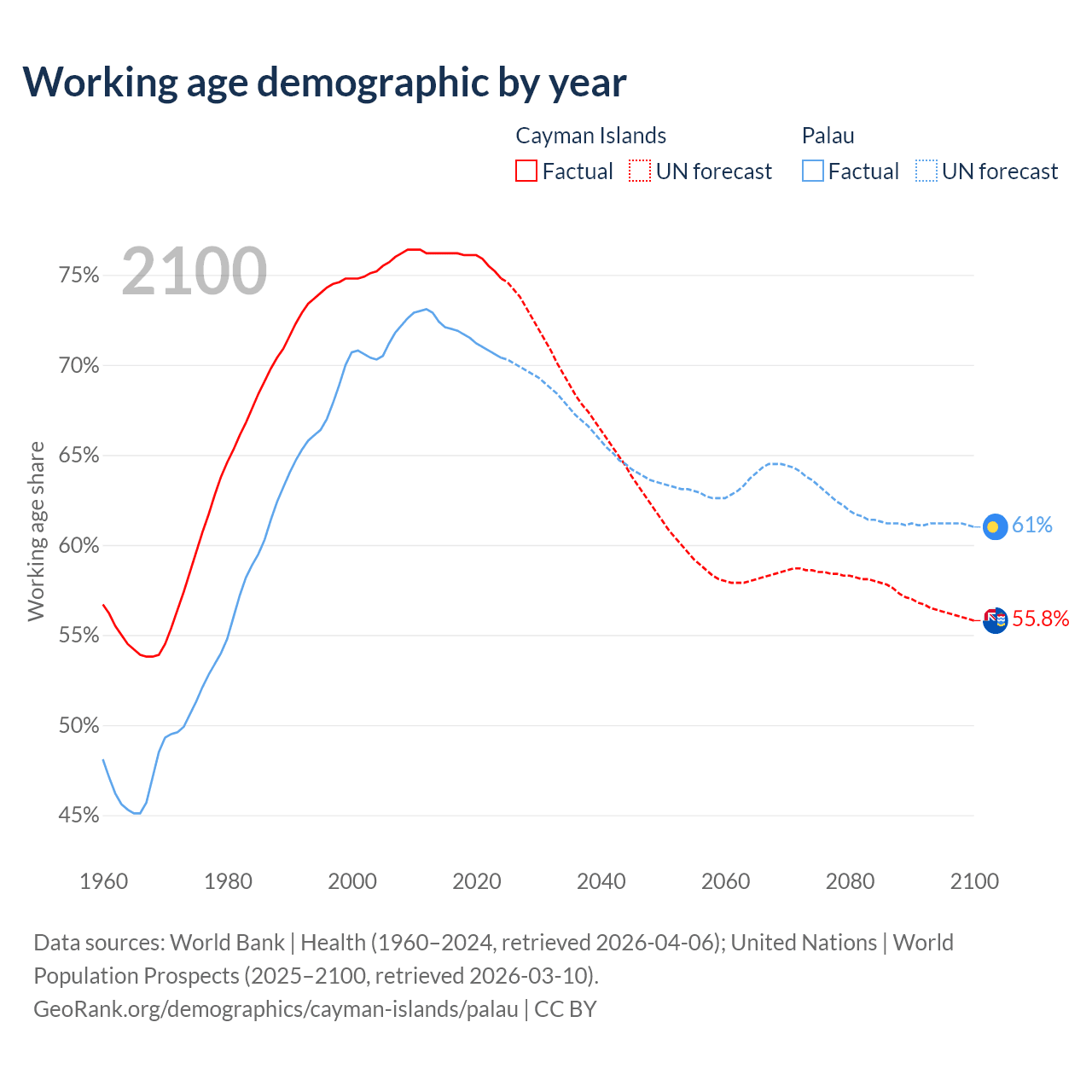 - The Cayman Islands has 58.1K working age adults (aged 15-64) vs 12.4K in Palau.