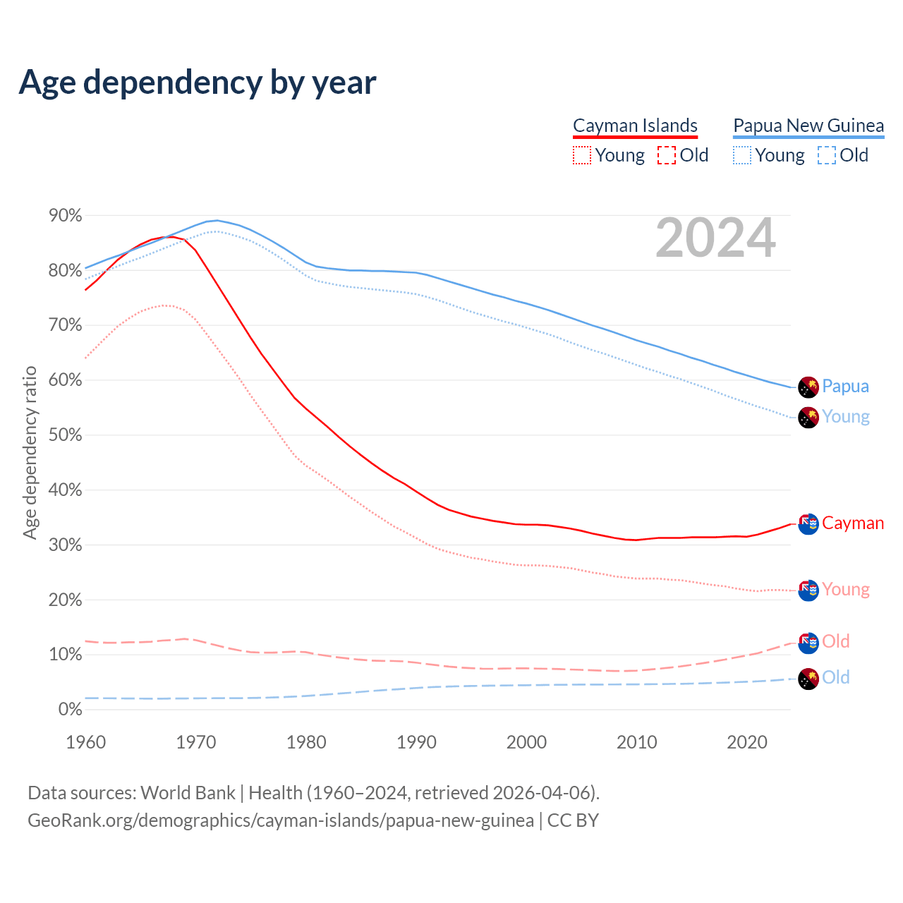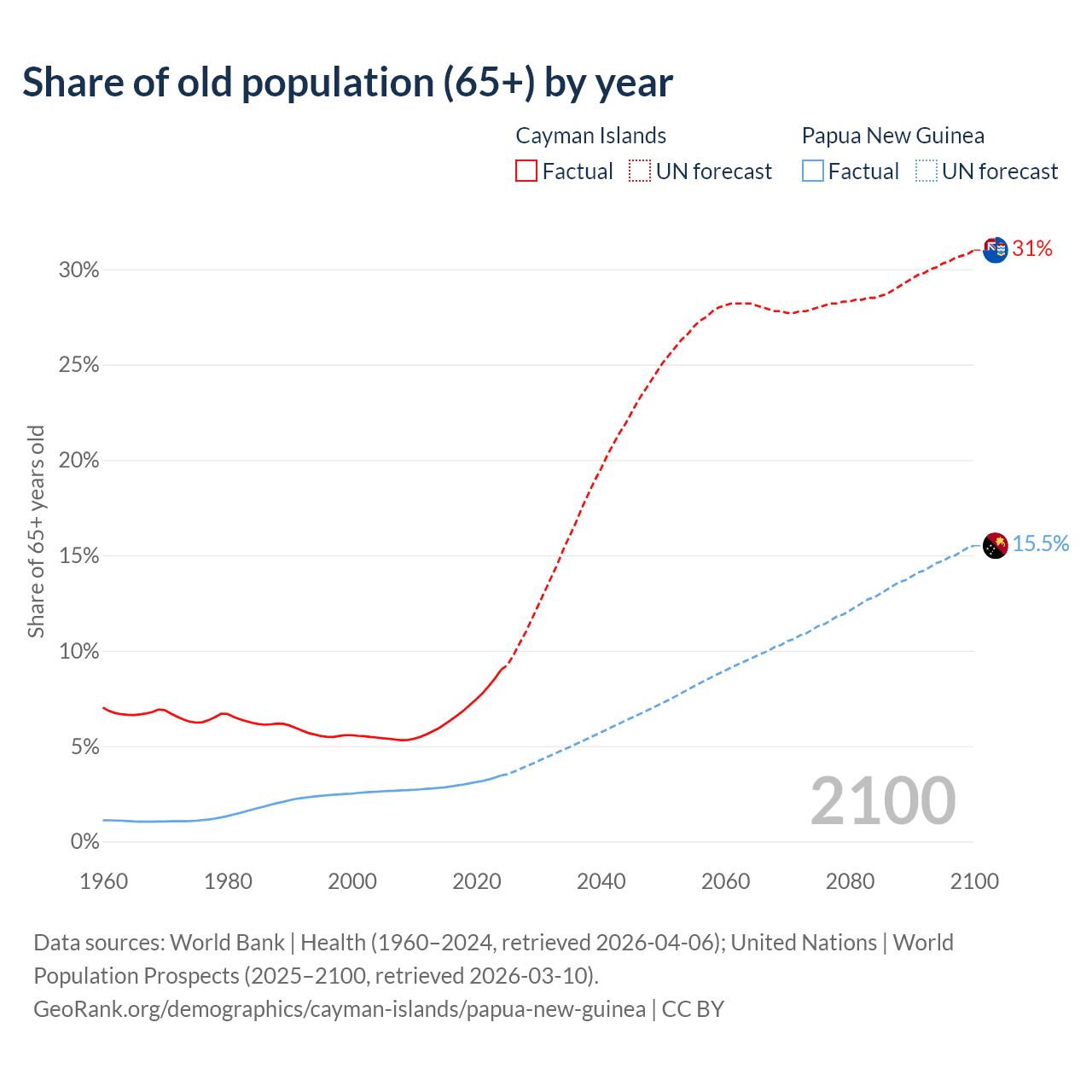 The share of older people aged 65 and over is 9% in the Cayman Islands and 3.46% in Papua New Guinea. Life expectancy in the Cayman Islands compared to Papua New Guinea .