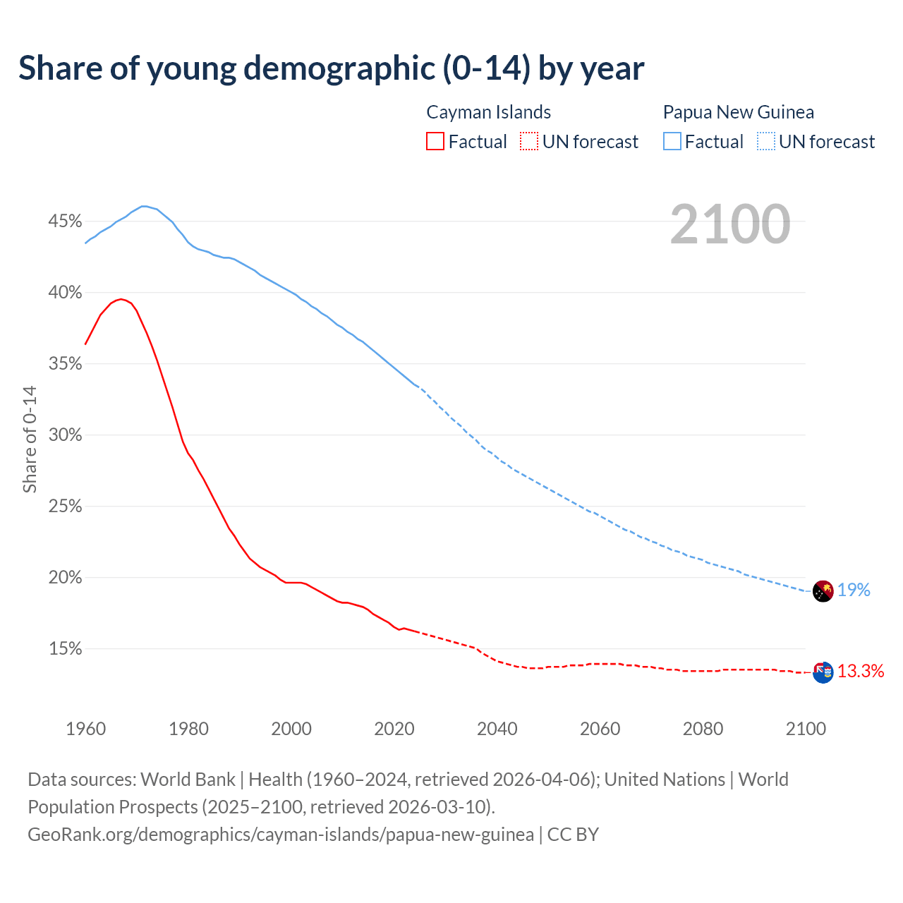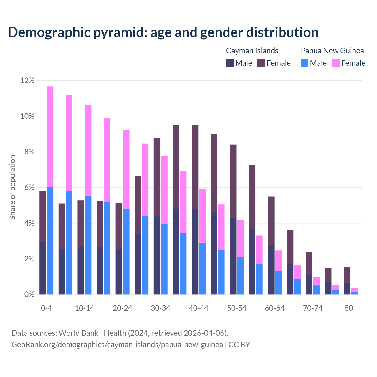 - The share of young demographic (0-15 years old) in the Cayman Islands is 16.2% vs 33.5% in Papua New Guinea.